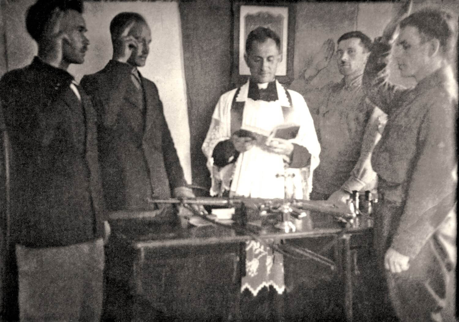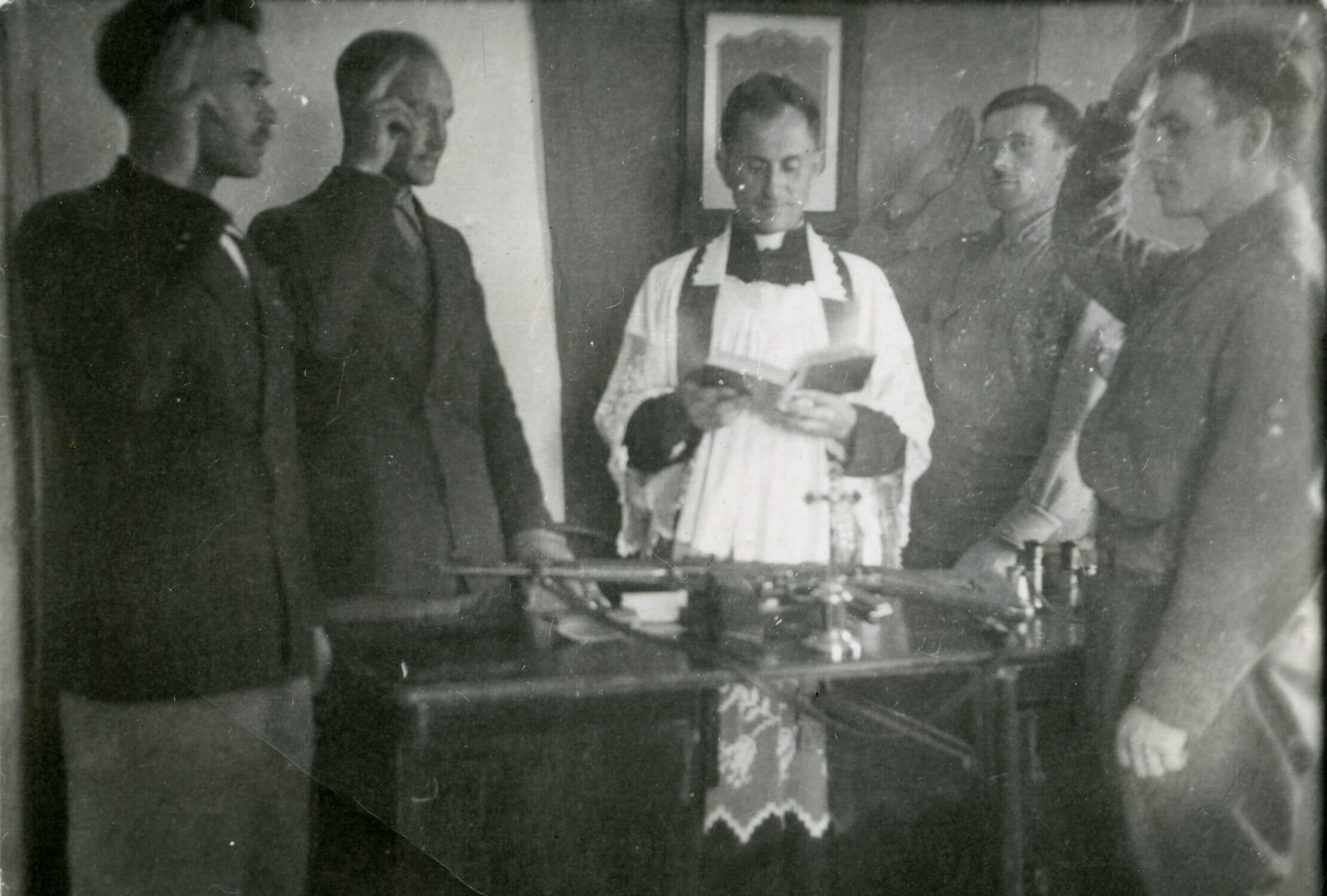 Tauro apygardos štabo narių priesaika. Iš kairės: Jonas Pileckis-Brokas, Leonas Taunys-Kovas, Antanas Ylius-Vilkas, Albinas Ratkelis-Oželis, Vytautas (Vitalius) Gavėnas-Vampyras. 1945 m. liepos 19 d., Skardupių klebonija (Marijampolės aps.)