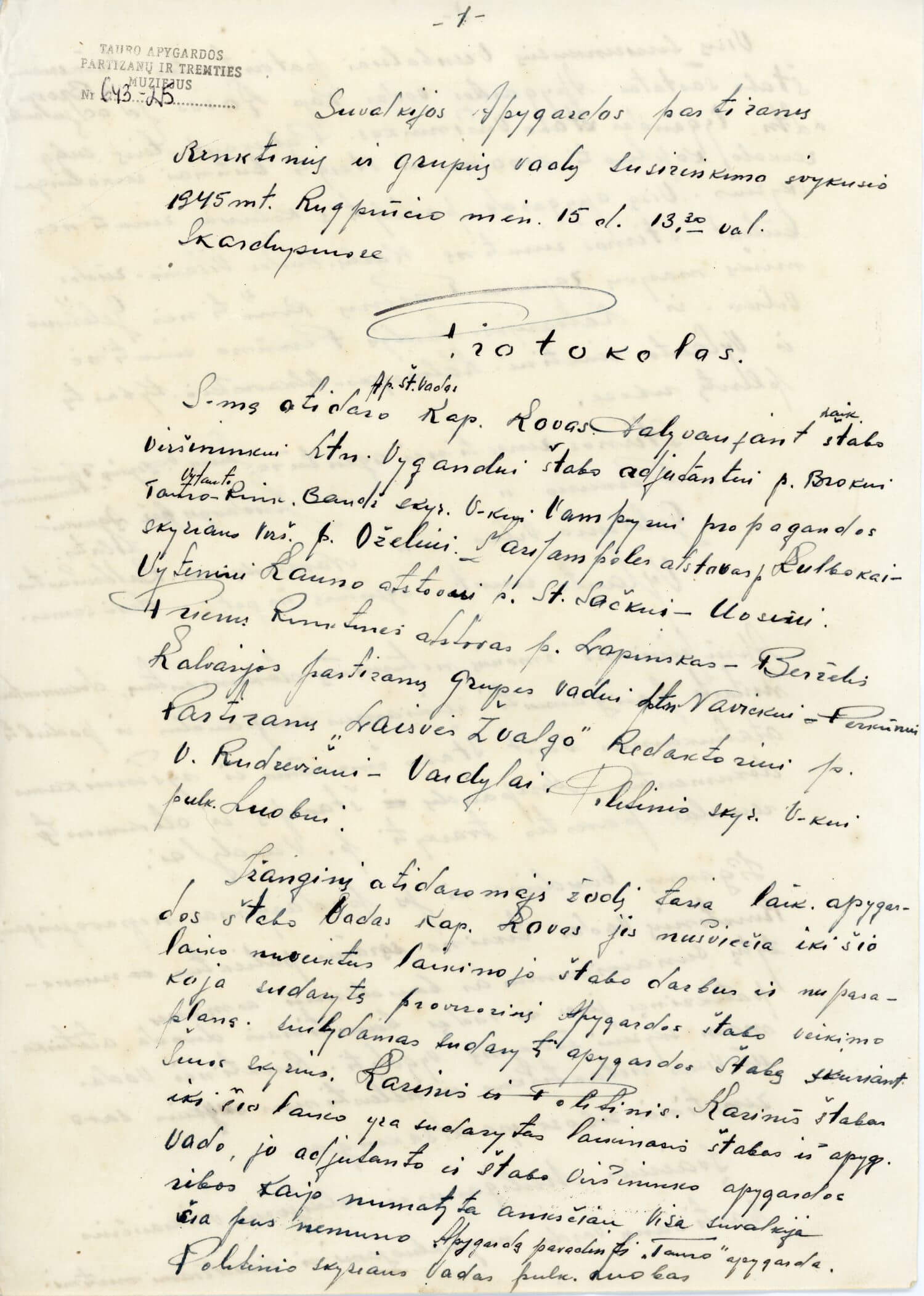 Tauro apygardos vadų susirinkimo protokolas. 1945 m. rugpjūčio 15 d. Skardupiai, (Marijampolės aps.)