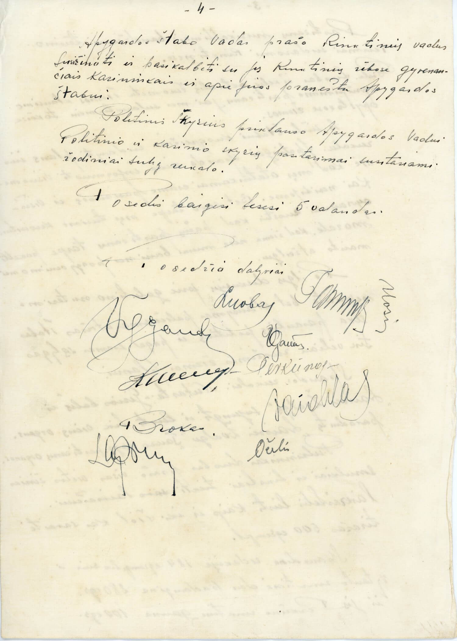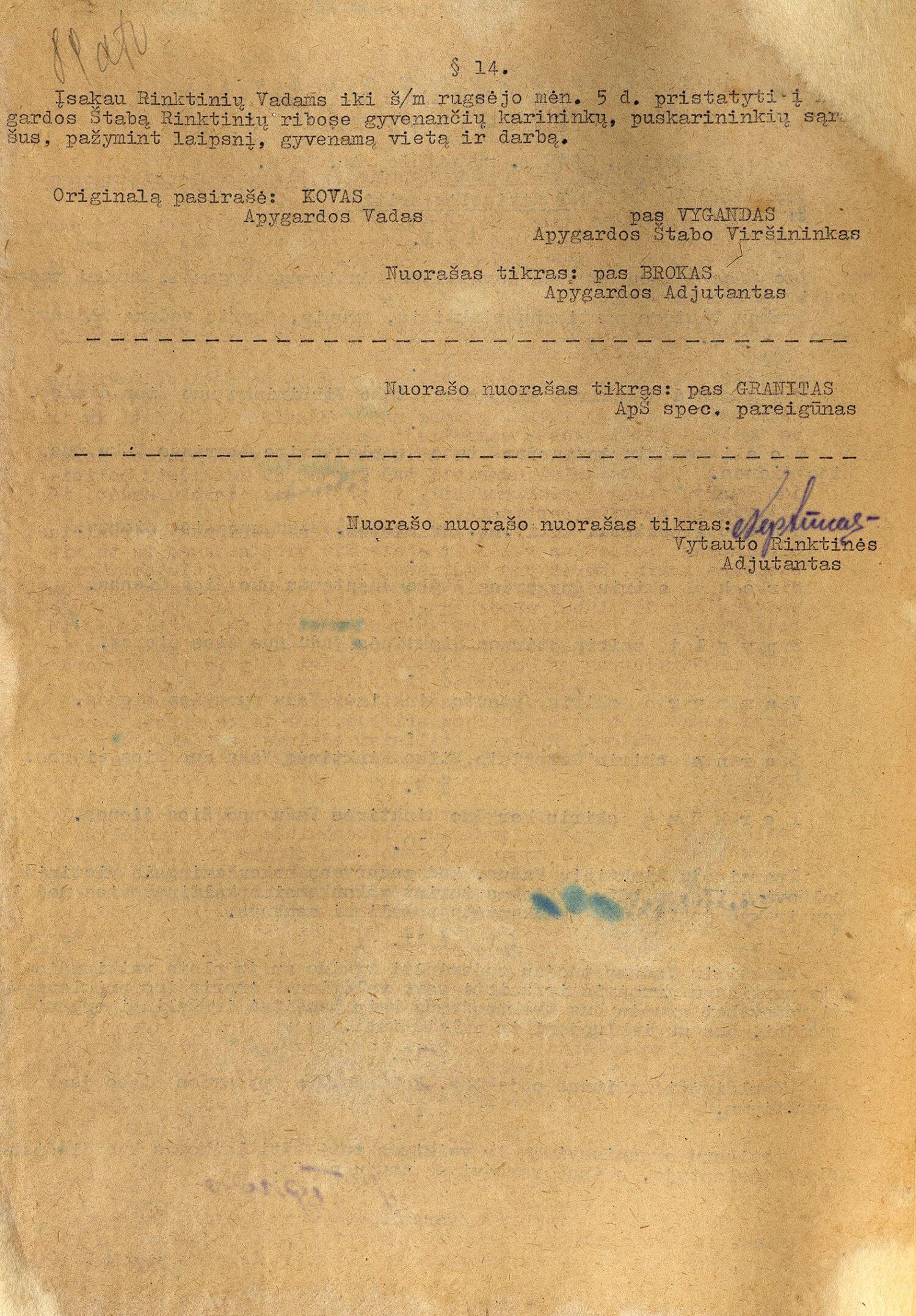 Dokumentą pasirašė: L. Taunys-Kovas, V. Bacevičius-Vygandas, L. Butkevičius-Luobas, S. Šačkus-Uosis, V. Gavėnas-Vampyras, V. Kulboka-Vytenis, V. Navickas-Perkūnas, V. Radzevičius-Vaidilas, K. Lapinskas-Birželis ir A. Ratkelis-Oželis