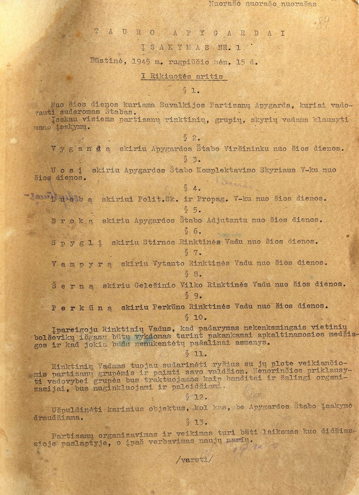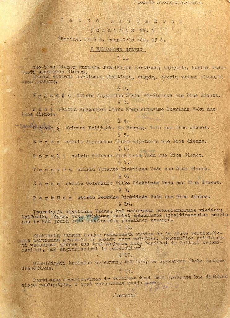 Pirmojo Tauro apygardos vado Leono Taunio-Kovo įsakymas dėl štabo narių paskyrimo. 1945 m. rugpjūčio 15 d.