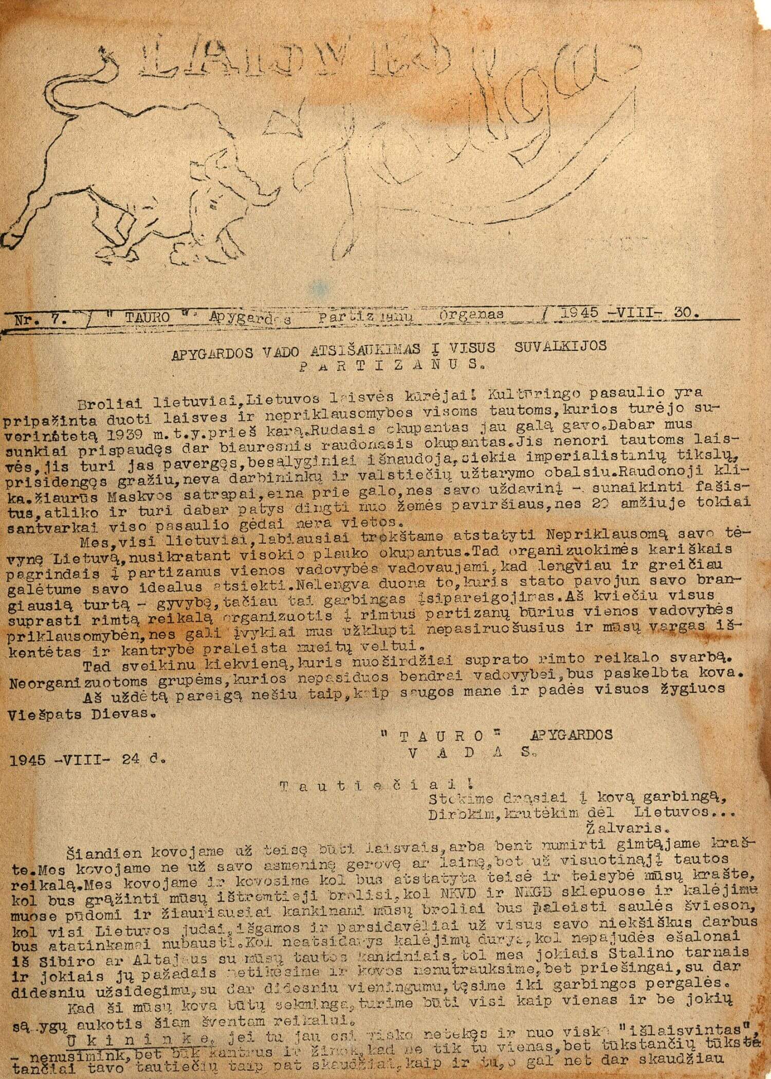 1945 m. liepos mėnesį Skardupiuose (Marijampolės aps.) parapijos klebono Antano Yliaus iniciatyva įvyko Tauro apygardos steigiamojo štabo posėdis. Savo atsiminimuose kun. A. Ylius rašė: „Mudu matėme, kad pavieniui nieko nebus galima padaryti: mudu priėjome išvados, kad reikia sukurti organizaciją, kuri sudraustų savivaliavimus ir visokius veiksmus atliktų labai rimtai apgalvoję ir juridiškai. <…> Ketvirtoji ir svarbiausia mūsų organizacijos priežastis, būtent, noras atskirti Lietuvą pagal konstituciją nuo Tarybų Sąjungos ir padaryti ją laisvą, lietuvišką, demokratinę ir nepriklausomą Respubliką“.