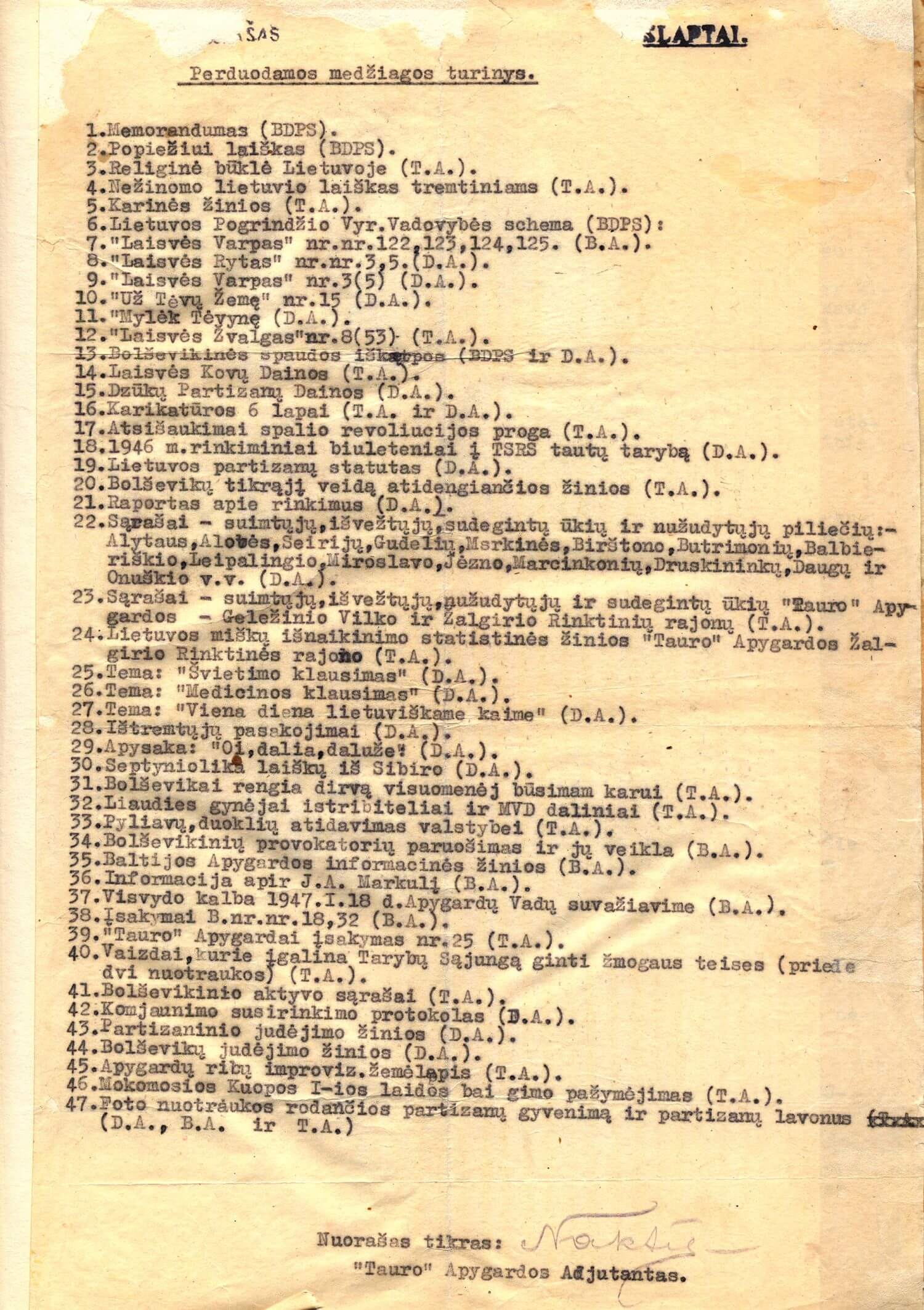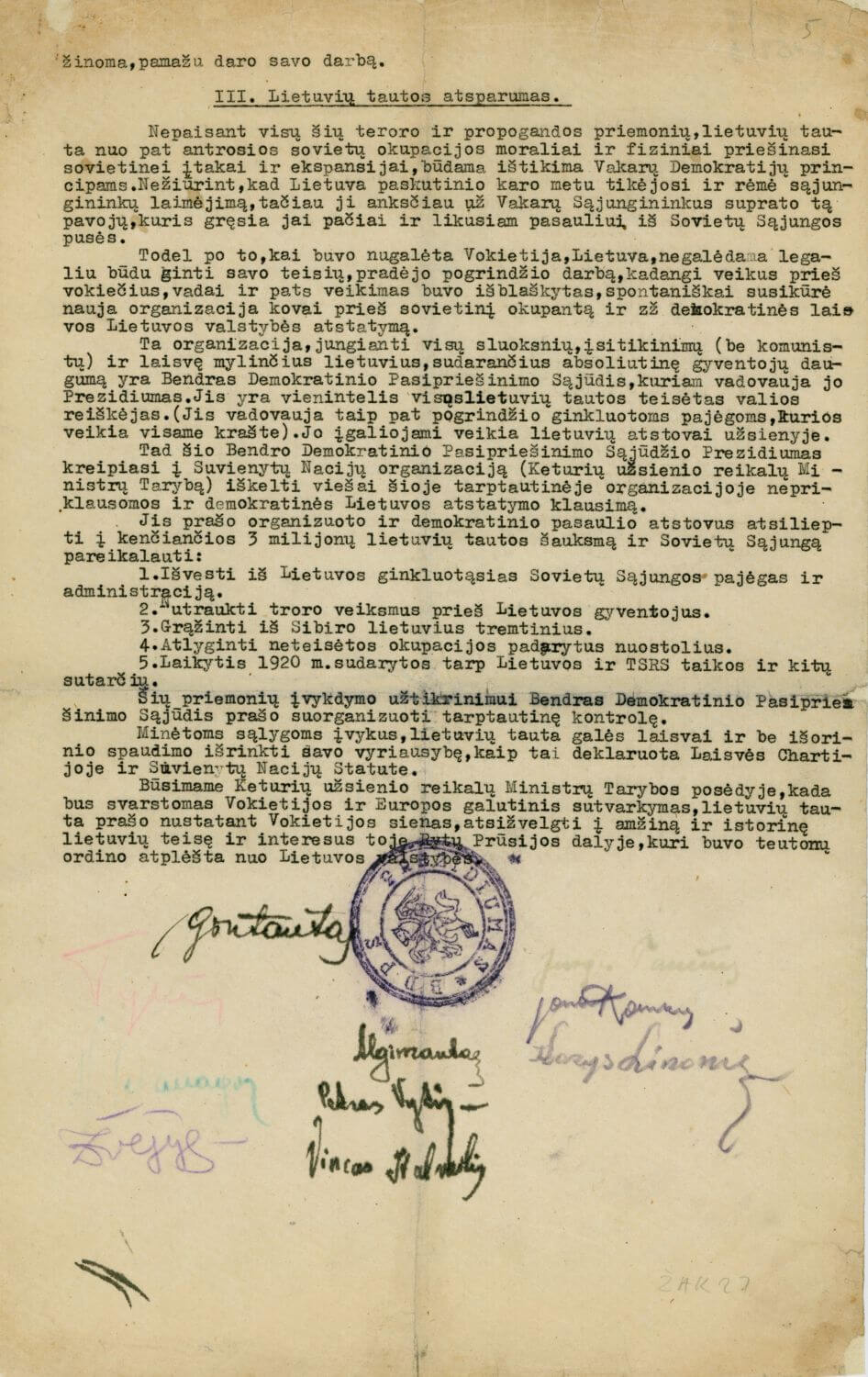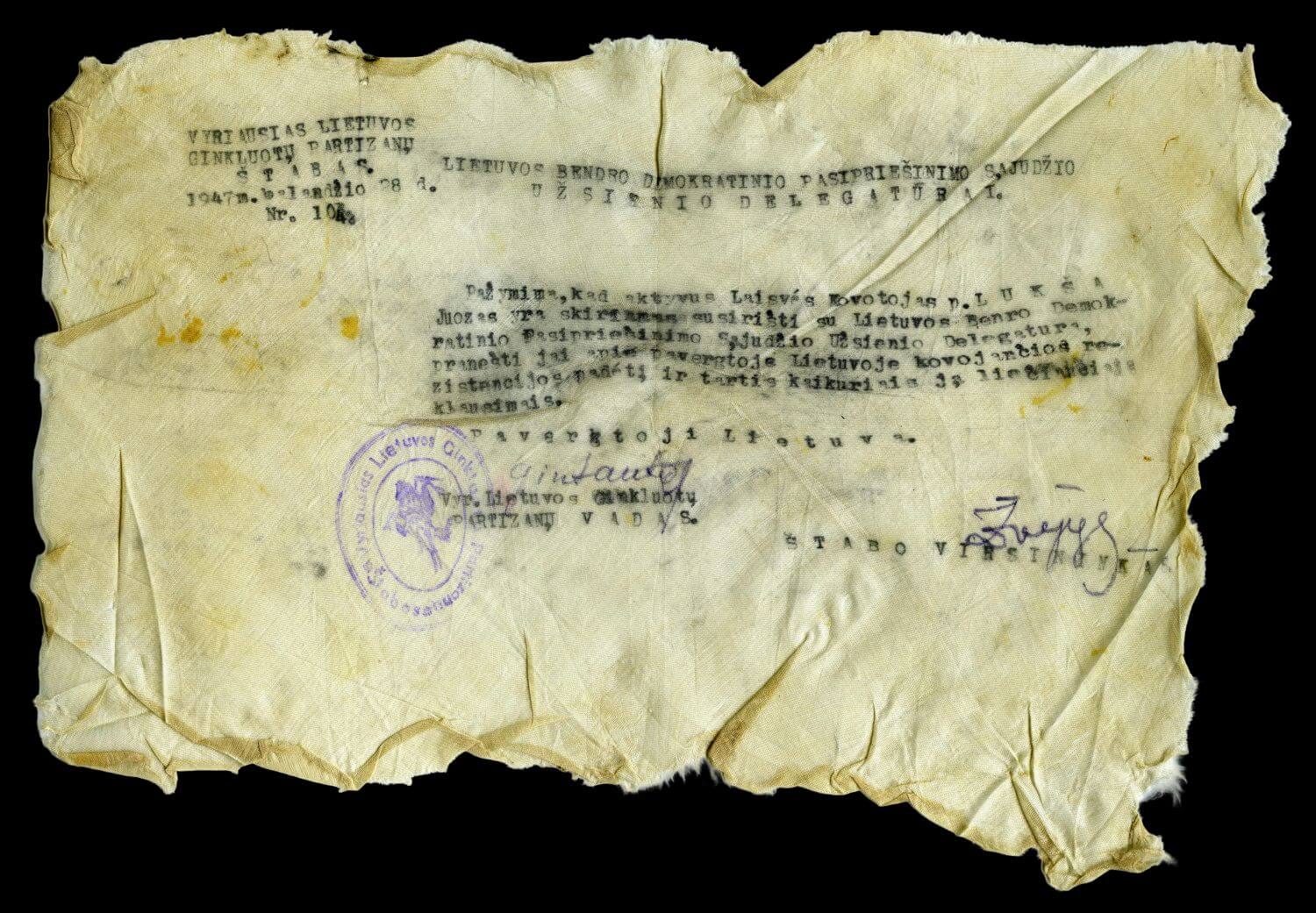 Dokumentas buvo skirtas gabenimui į užsienį, konspiracijos tikslais atspausdintas ant šilkinės medžiagos. 1947 m. balandžio 28 d.
