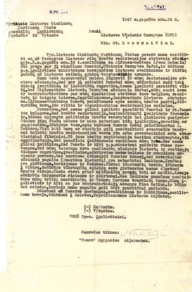 Vyriausiojo ginkluotųjų pajėgų štabo įgaliotinių užsieniui Jurgio Krikščiūno-Vytauto ir Juozo Lukšos-Kęstučio laiškas Lietuvos diplomatinės tarnybos vadovui Stasiui Lozoraičiui. 1947 m. gegužės mėn.