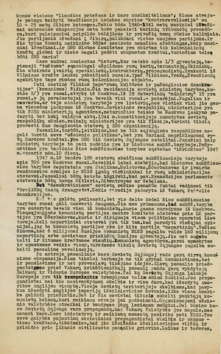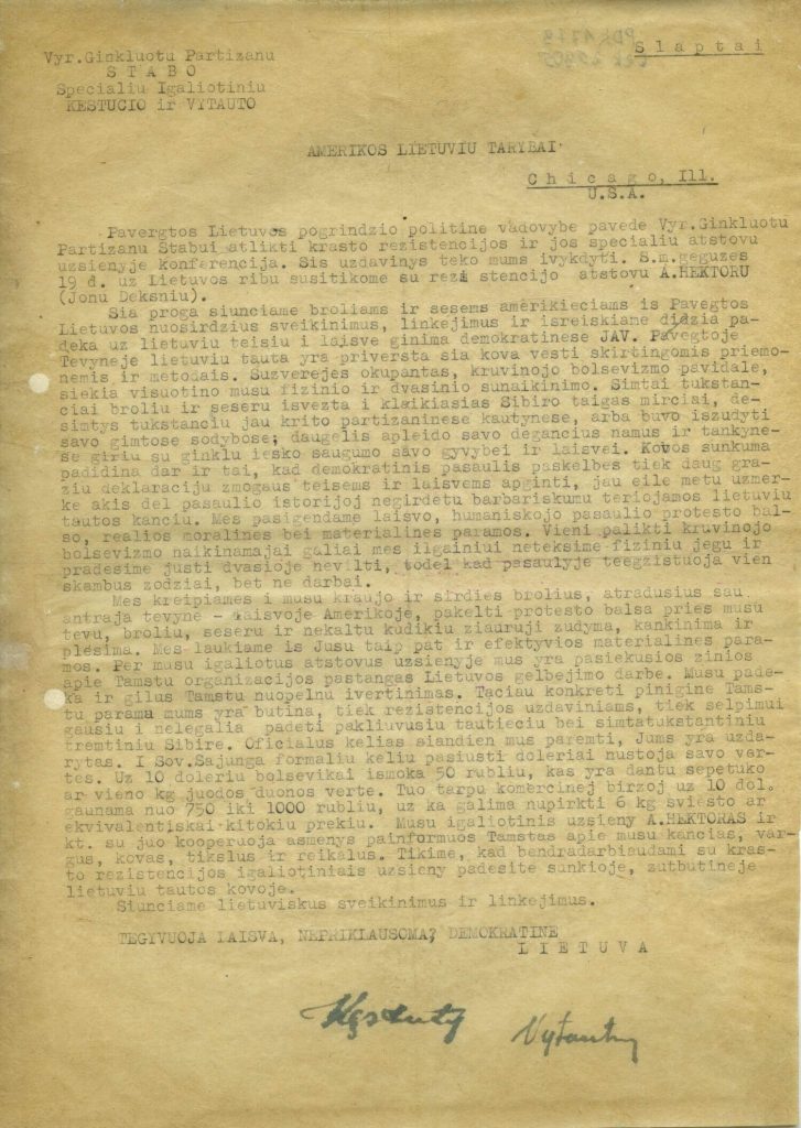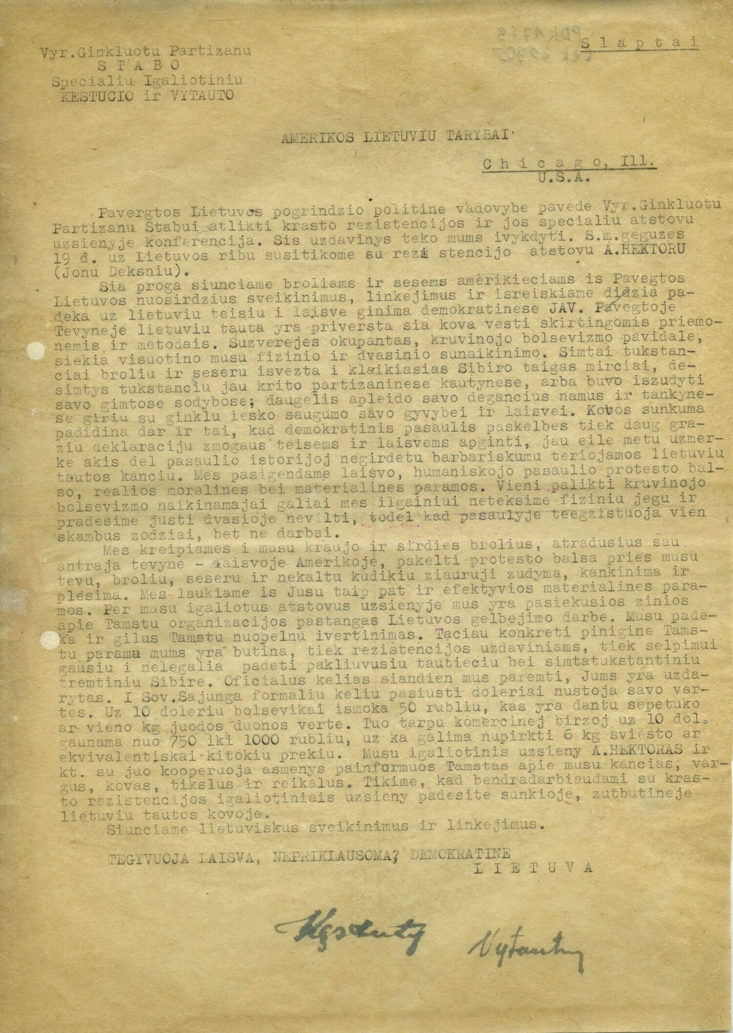 Vyriausiojo ginkluotųjų pajėgų štabo įgaliotinių užsieniui Jurgio Krikščiūno-Vytauto ir Juozo Lukšos-Kęstučio kreipimasis į Amerikos lietuvių tarybą. 1947 m. gegužės mėn.