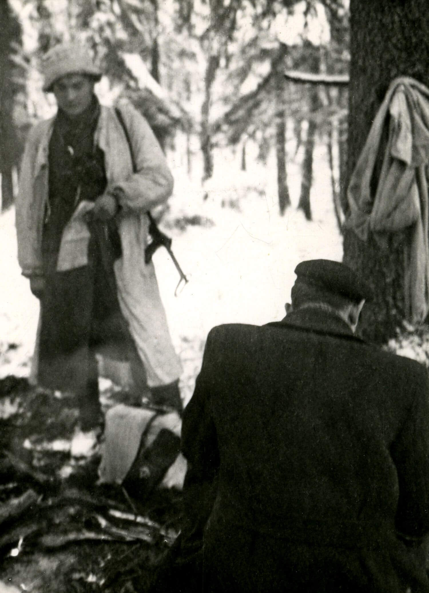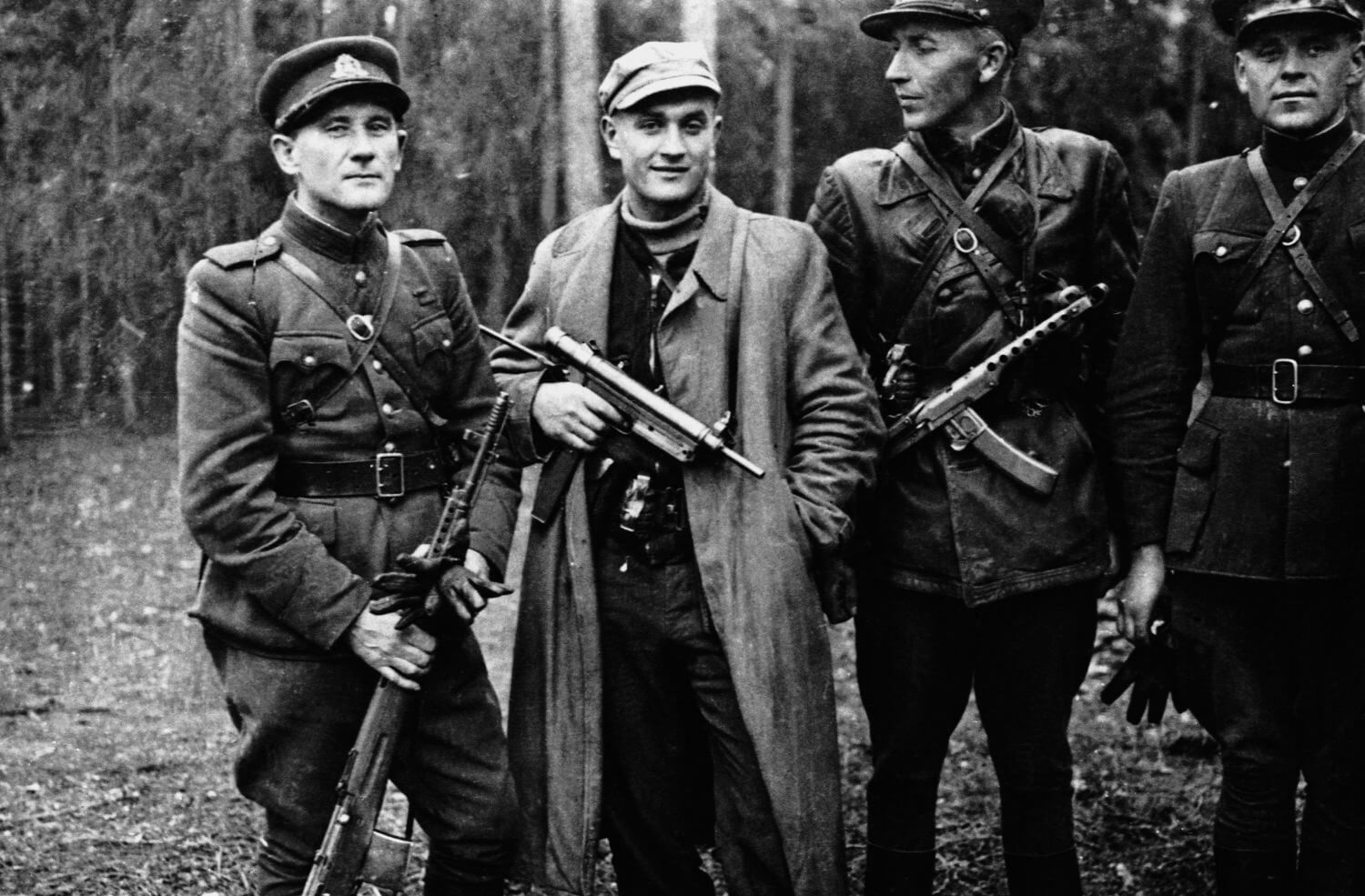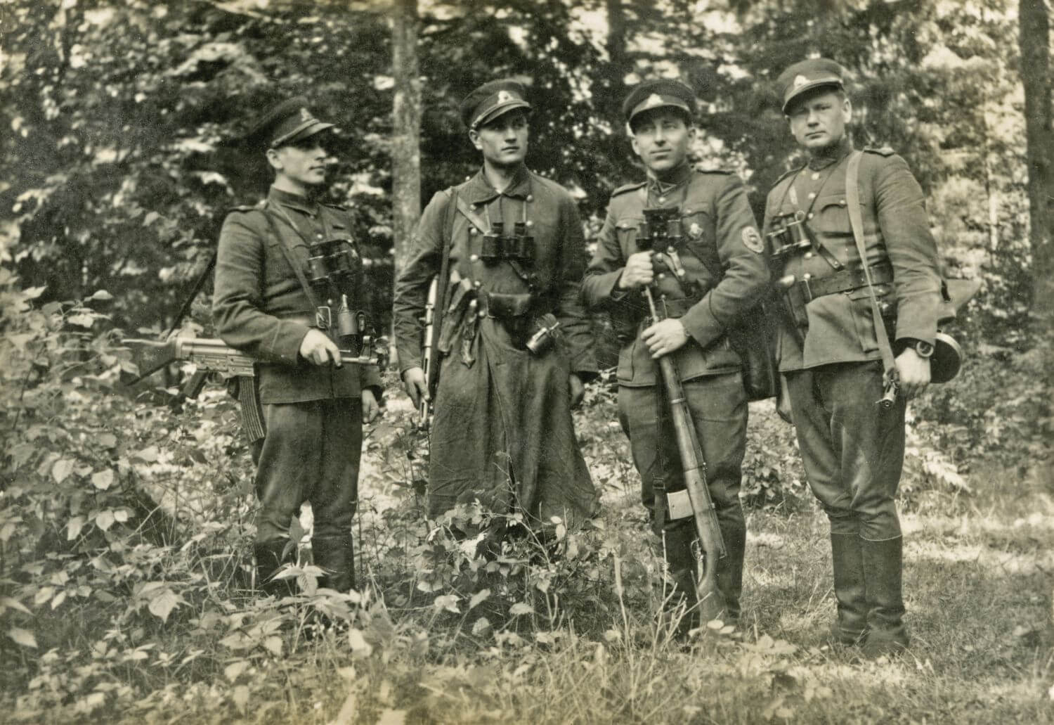 Vyriausiojo ginkluotųjų pajėgų štabo įgaliotiniai užsieniui Jurgis Krikščiūnas-Vytautas (sėdi) ir Juozas Lukša-Kęstutis (prigulęs) pakeliui į Lenkiją. Antroje eilėje stovi juos lydintys Tauro apygardos partizanai (iš kairės): Aleksas Keleris-Tigras, Vytautas (Vitalius) Gavėnas-Vampyras ir Stasys Gurevičius-Nykštukas. Aistiškių miškas, 1947 m. gegužės 12 d.