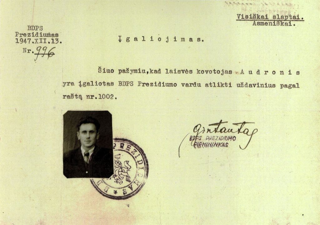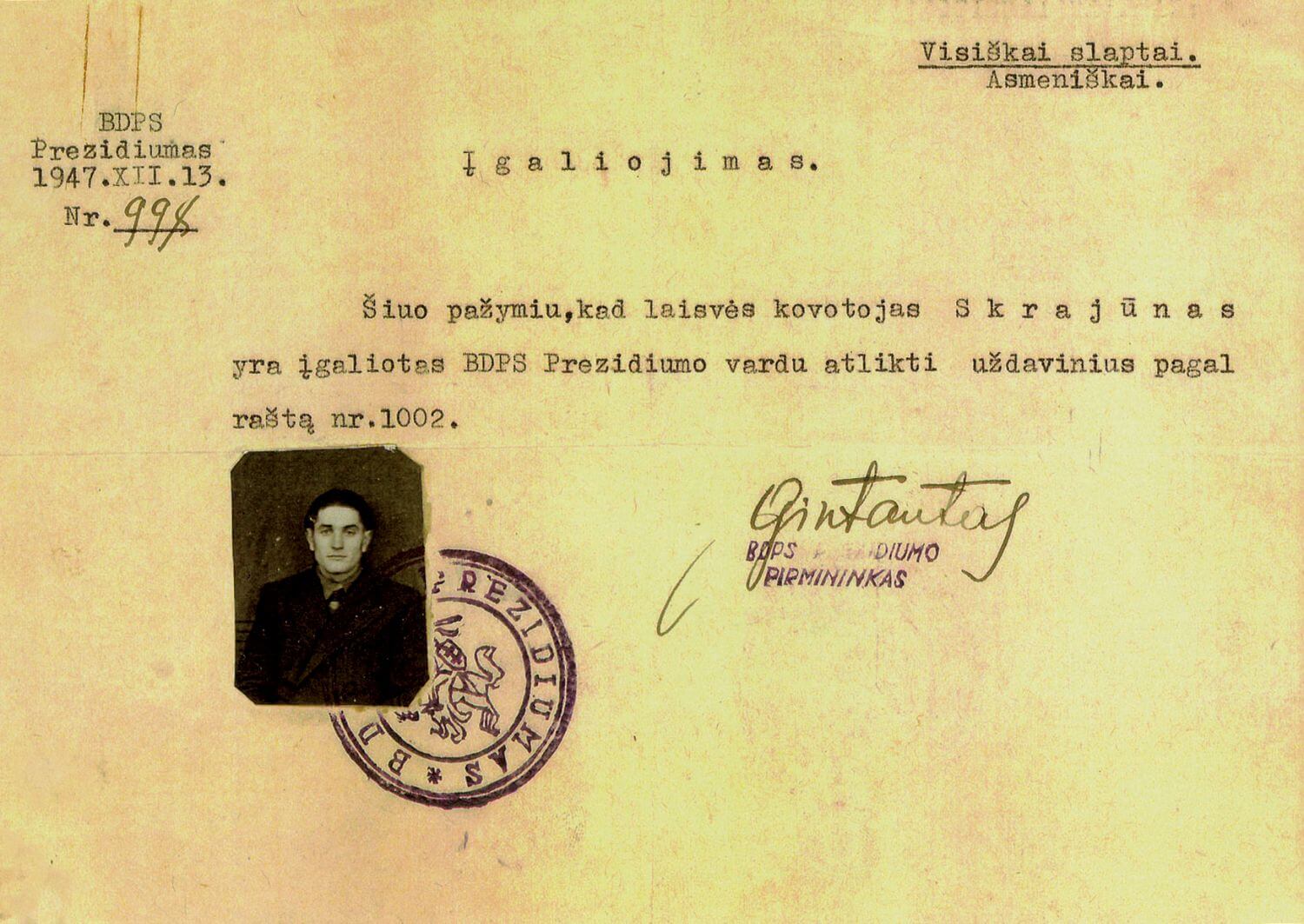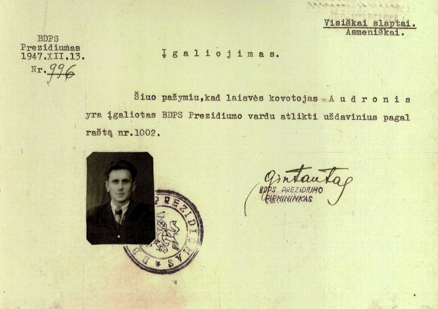 Bendrojo demokratinio pasipriešinimo sąjūdžio prezidiumo įgaliojimai, skirti Juozui Lukšai-Skrajūnui ir Kazimierui Pypliui-Audroniui. 1947 m. gruodžio 13 d.