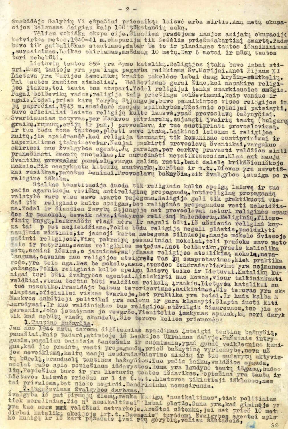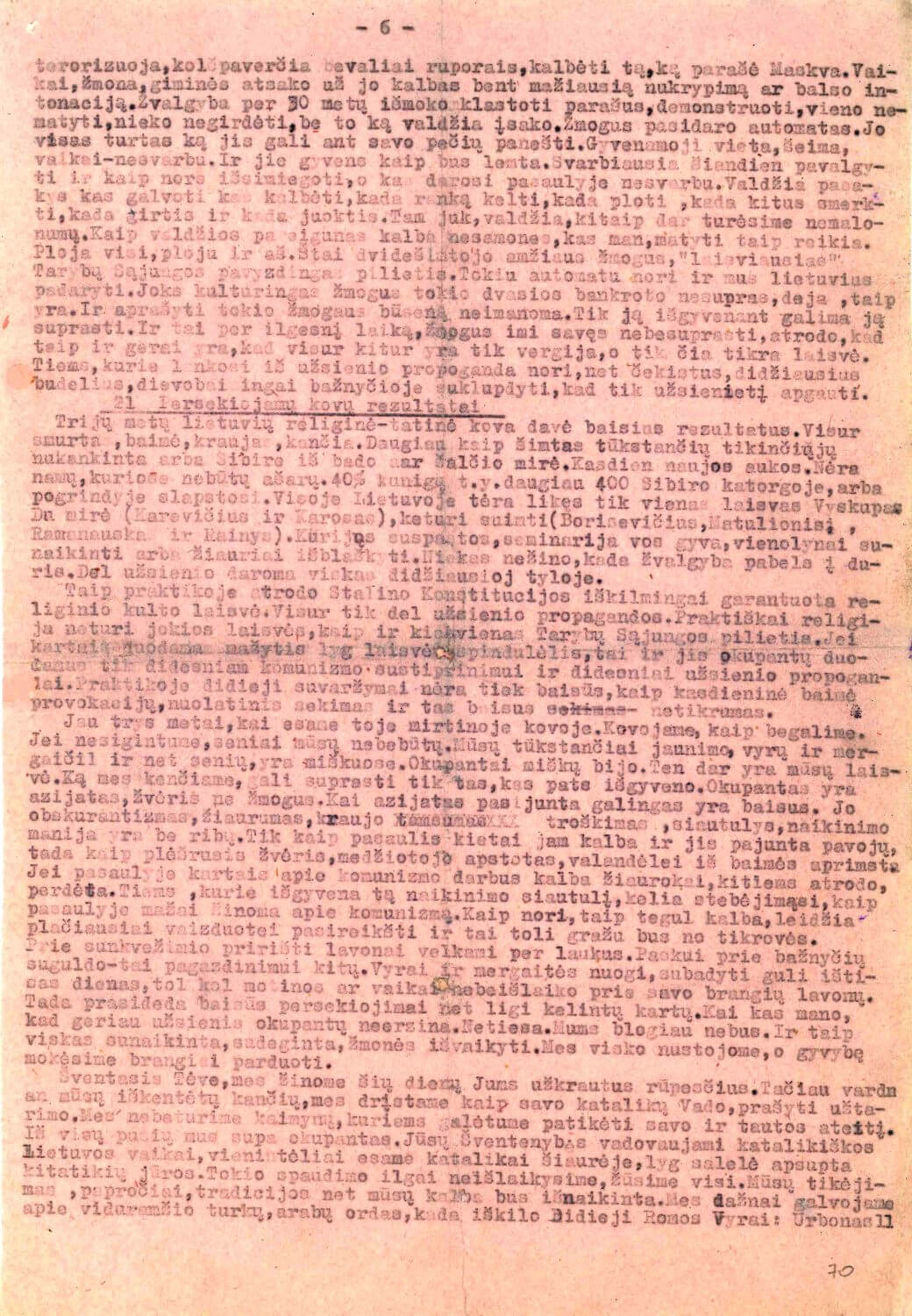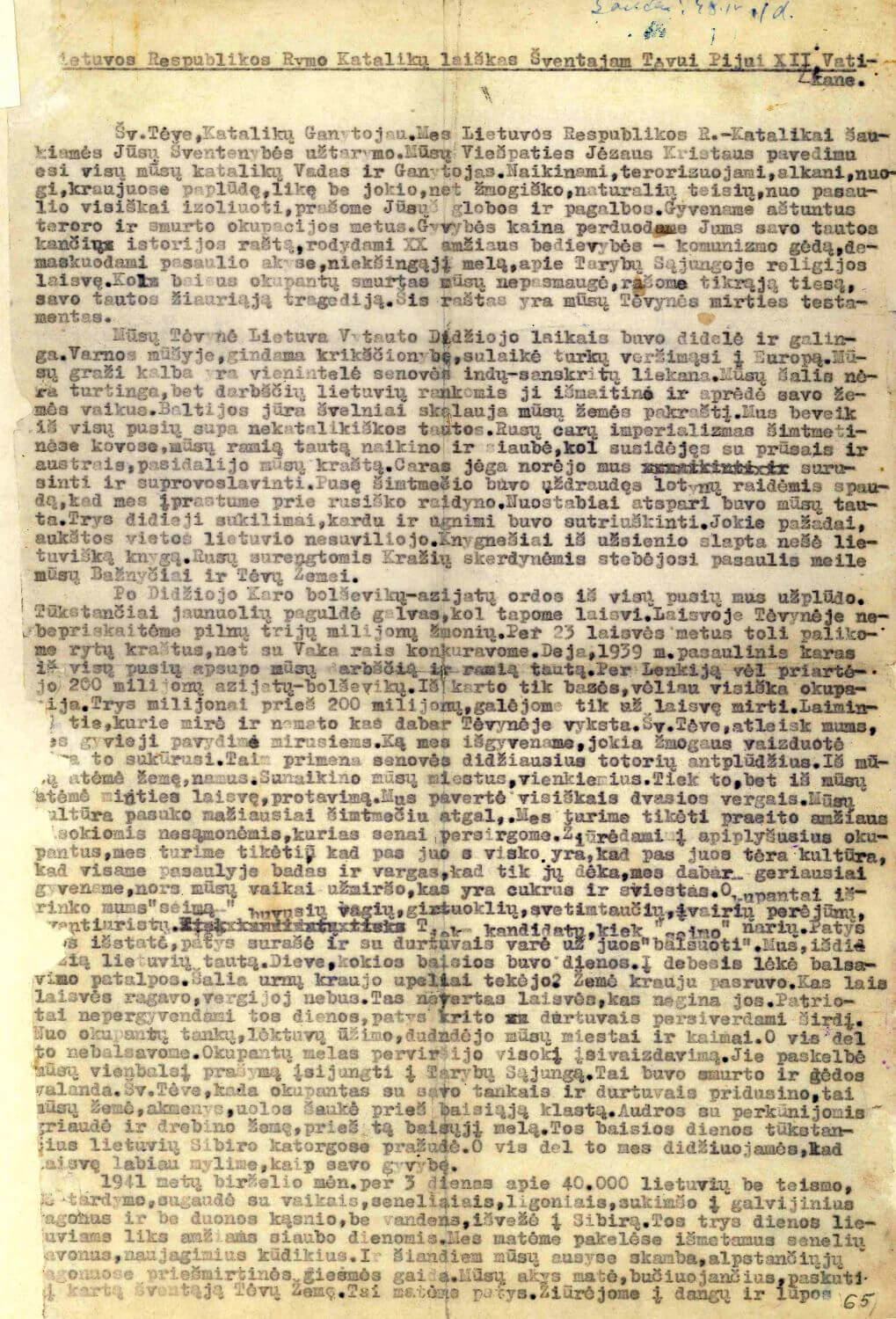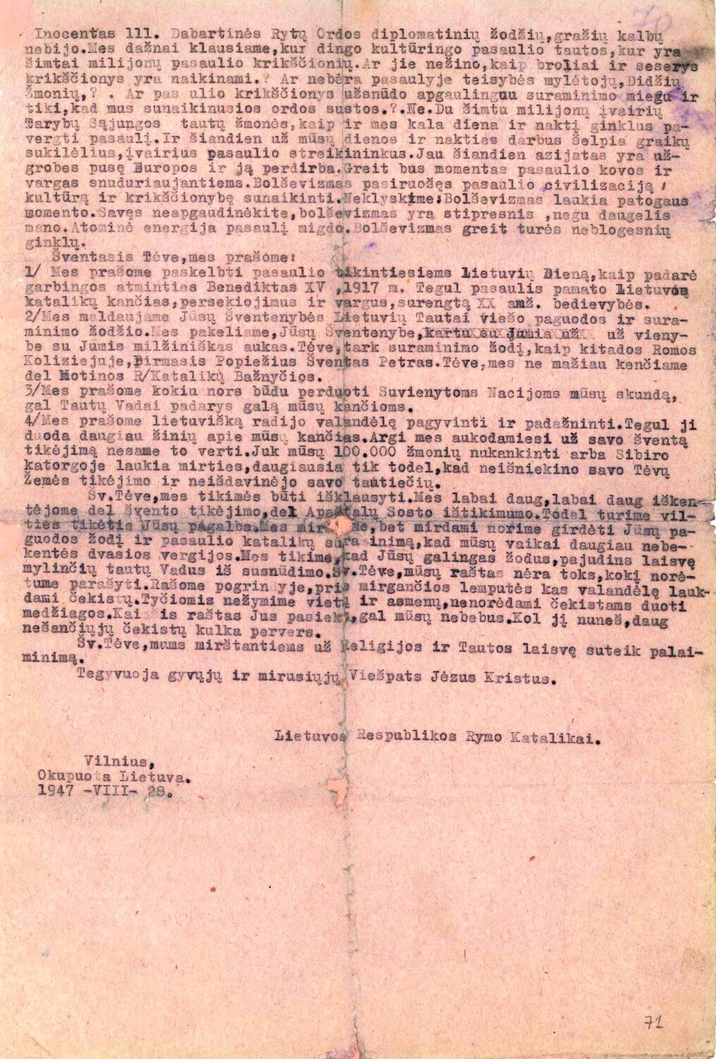 Lietuvos Respublikos Romos katalikų laiškas Popiežiui Pijui XII, kuriame aprašoma sovietų valdžios persekiojama Katalikų bažnyčia ir prašoma užtarimo bei palaimos. Laiško autorius kun. Juozas Stankūnas. 1947 m.