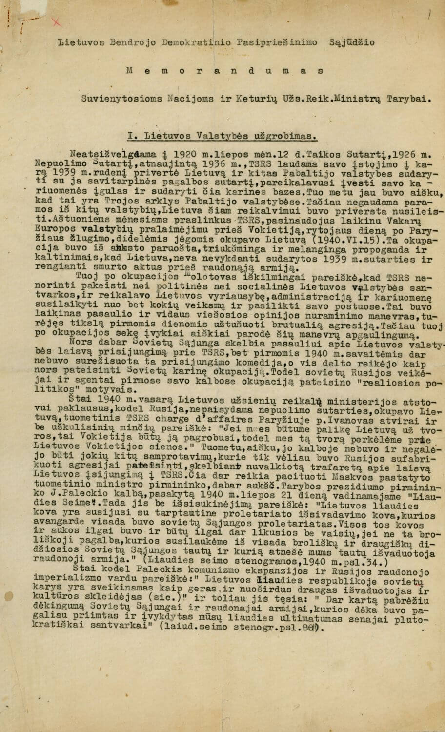 Lietuvos laisvės kovotojų parengtas ir pasirašytas memorandumas „Suvienytųjų nacijų organizacijai ir Keturių Užsienio reikalų ministrų tarybai“, kuriame aprašyta padėtis Lietuvoje ir prašoma pagalbos kovojant prieš sovietų vykdomą okupaciją. 1947 m.