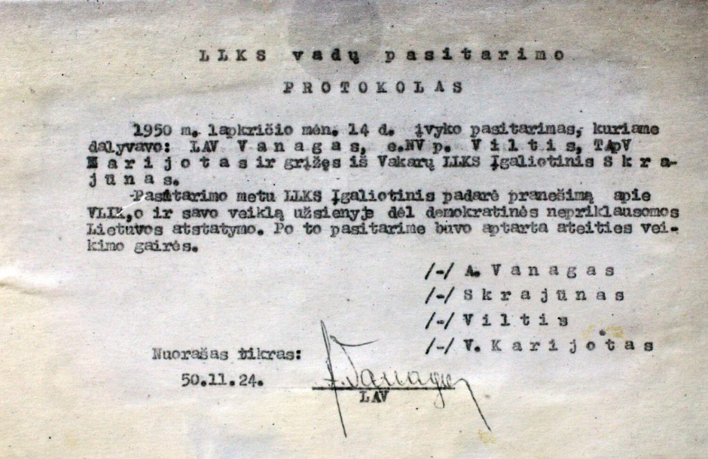 1950 m. lapkričio mėn. vykusio Lietuvos laisvės kovos sąjūdžio (LLKS) vadų susitikimo, kuriame dalyvavo iš Vakarų grįžęs LLKS įgaliotinis Juozas Lukša-Skrajūnas, protokolo nuorašas.