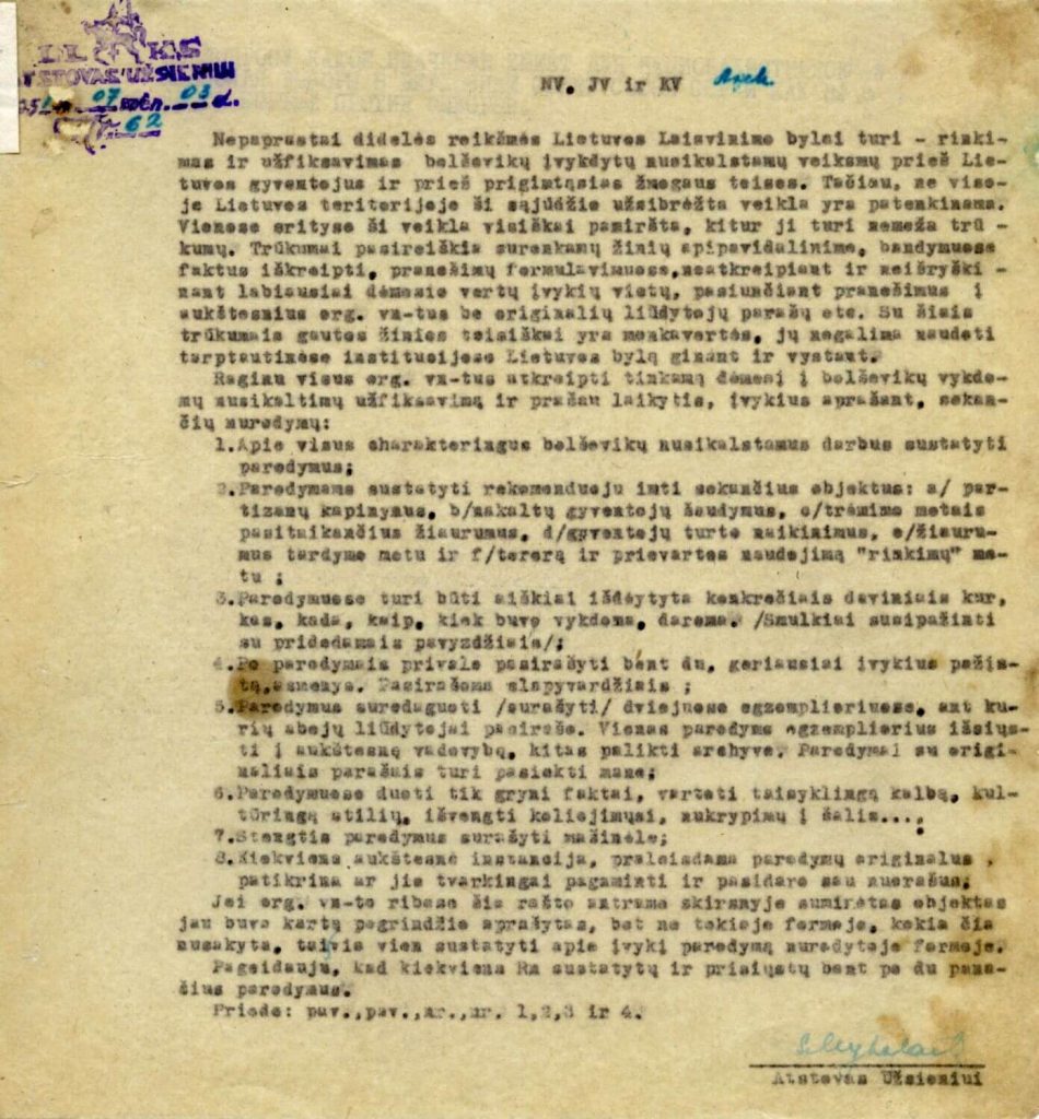 Lietuvos laisvės kovos sąjūdžio atstovo užsieniui Juozo Lukšos-Mykolaičio nurodymai Pietų Lietuvos (Nemuno), Vakarų Lietuvos (Jūros) ir Šiaurės Rytų Lietuvos (Kalnų) sričių partizanų vadams dėl sovietinio režimo įvykdytų nusikaltimų fiksavimo svarbos. 1951 m. liepos 3 d.