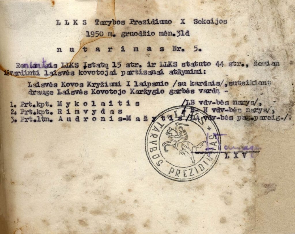 Lietuvos laisvės kovos sąjūdžio (LLKS) Tarybos prezidiumo nutarimas: suteikti Laisvės kovotojo karžygio vardą LLKS visuomeninės dalies [Politinio skyriaus viršininkui] Juozui Lukšai-Mykolaičiui, Dainavos apygardos štabo viršininkui Jurgiui Krikščiūnui-Rimvydui ir Tauro apygardos štabo pareigūnui Kazimierui Pypliui-Audroniui bei apdovanoti juos I laipsnio Laisvės kovos kryžiumi su kardais. 1950 m. gruodžio 31 d.