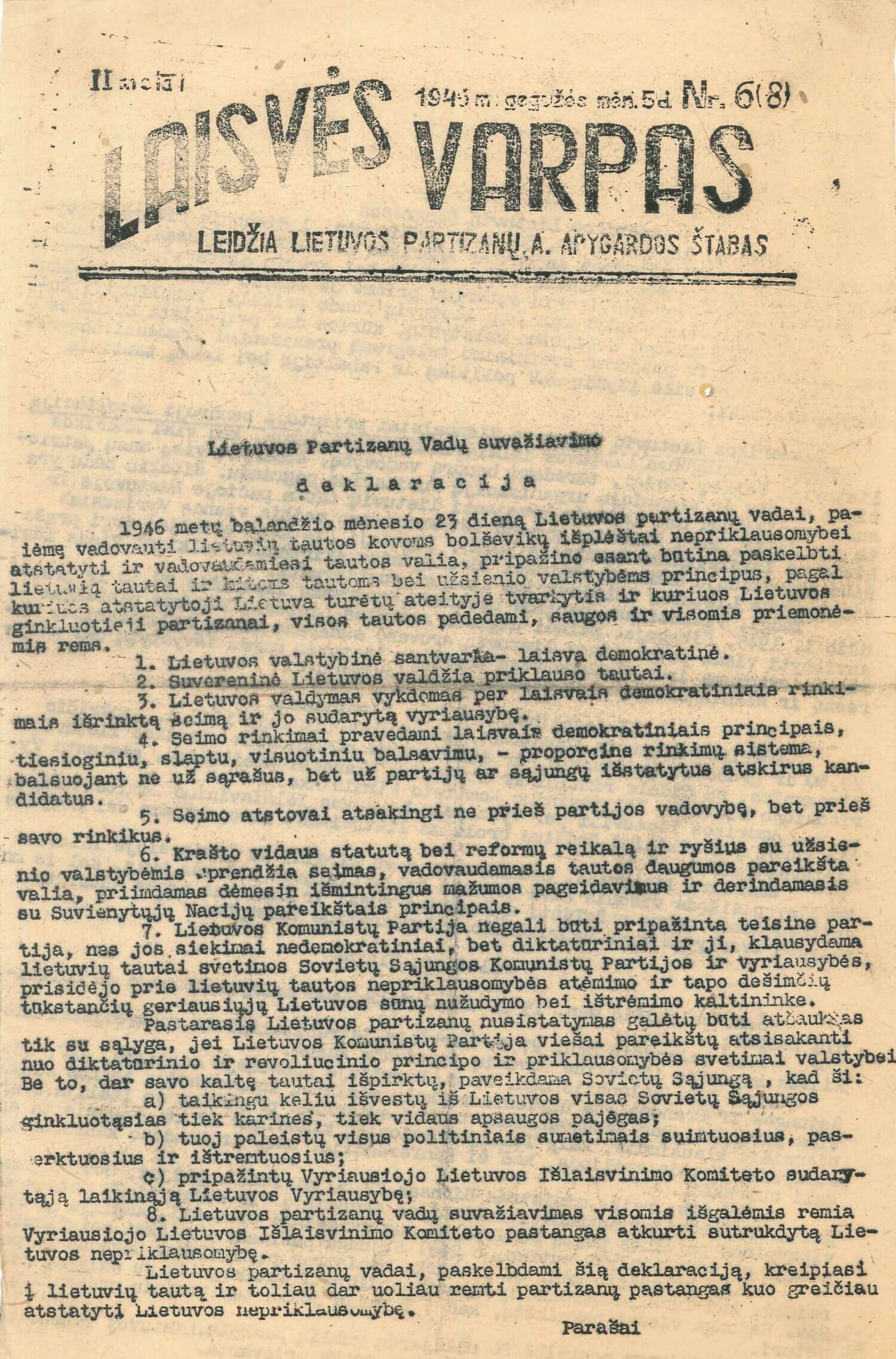 Lietuvos partizanų vadų suvažiavimo deklaracija atspausdinta pogrindiniame laikraštyje „Laisvės varpas“. 1946 m. gegužės 5 d. Nr. 6(8).