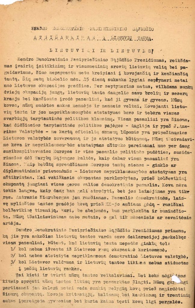 Bendrojo demokratinio pasipriešinimo sąjūdžio (BDPS) Prezidiumo atsišaukimas „Lietuviai ir lietuvės!“. 1947 m.