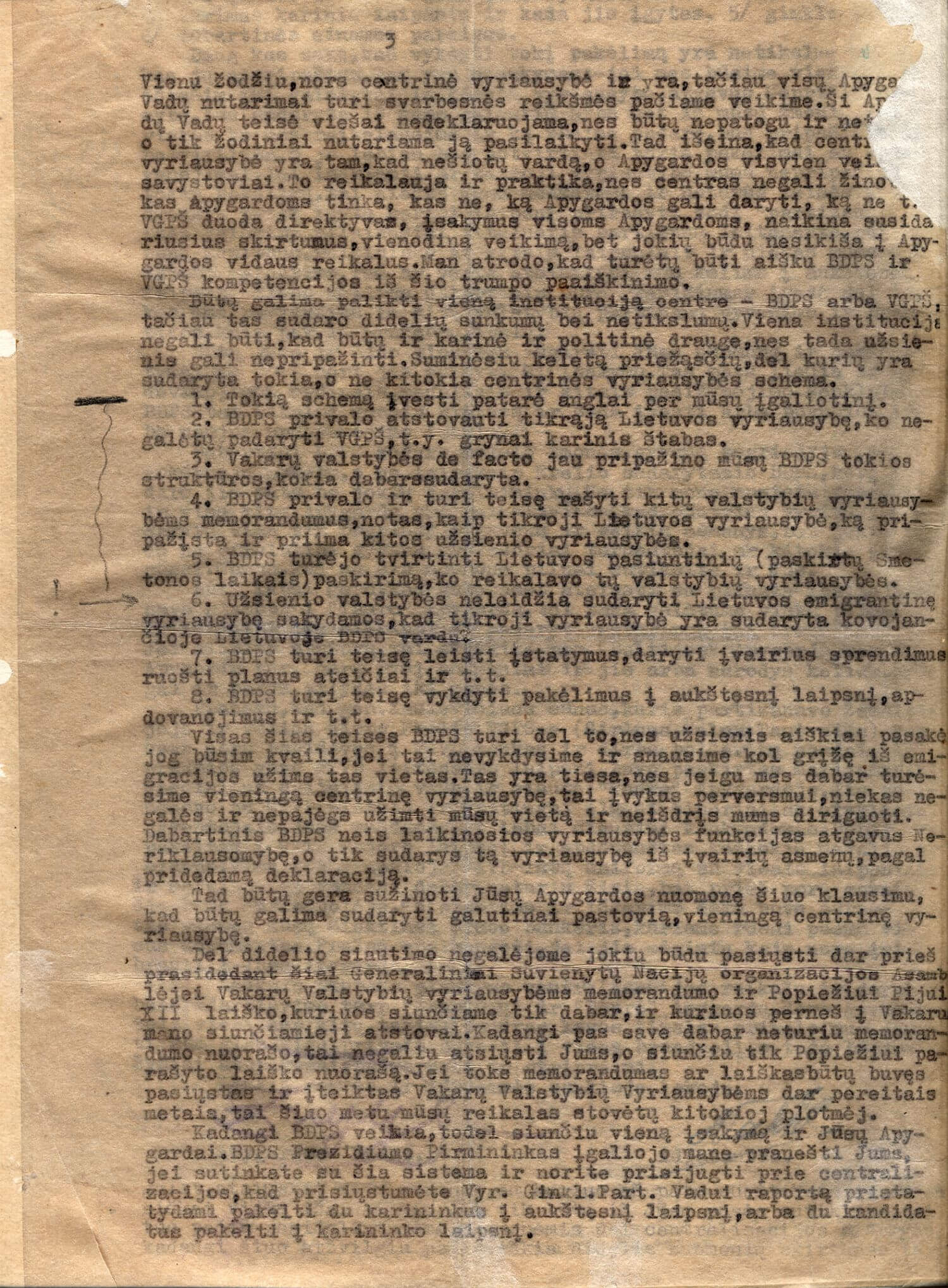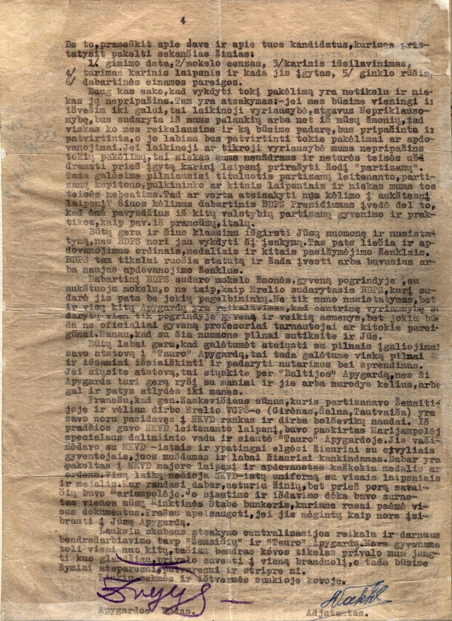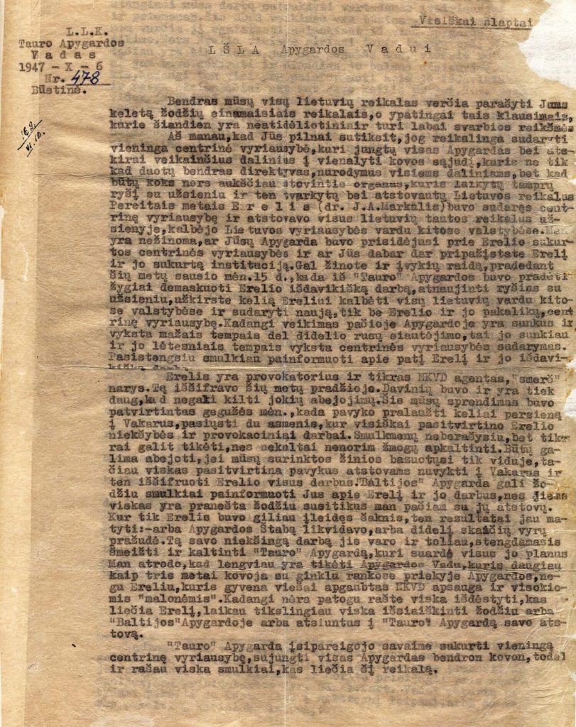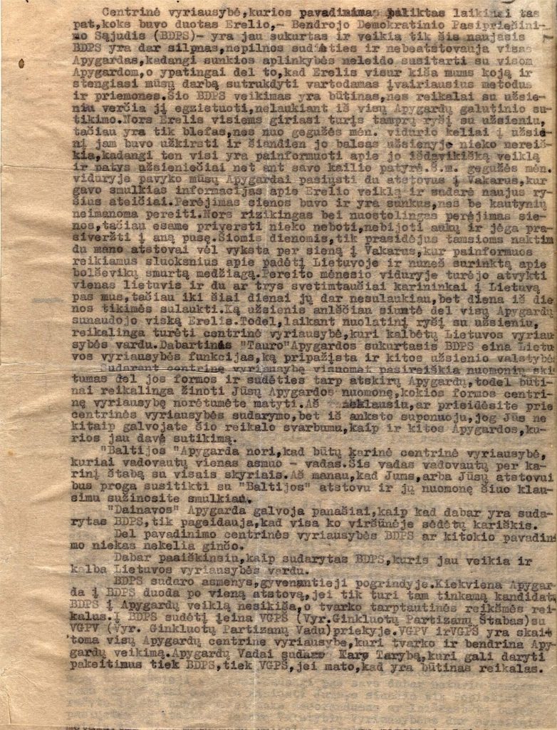 Tauro apygardos vado Antano Baltūsio-Žvejo raštas Vytauto apygardos vadui dėl Bendrojo demokratinio pasipriešinimo sąjūdžio (BDPS) veiklos, partizanų struktūrų centralizavimo ir vyriausiosios vadovybės sudarymo, sovietų saugumo agento Juozo Markulio-Erelio demaskavimo, Algimanto Zaskevičiaus-Tautvaišos išdavystės ir kt. 1947 m. spalio 6 d.