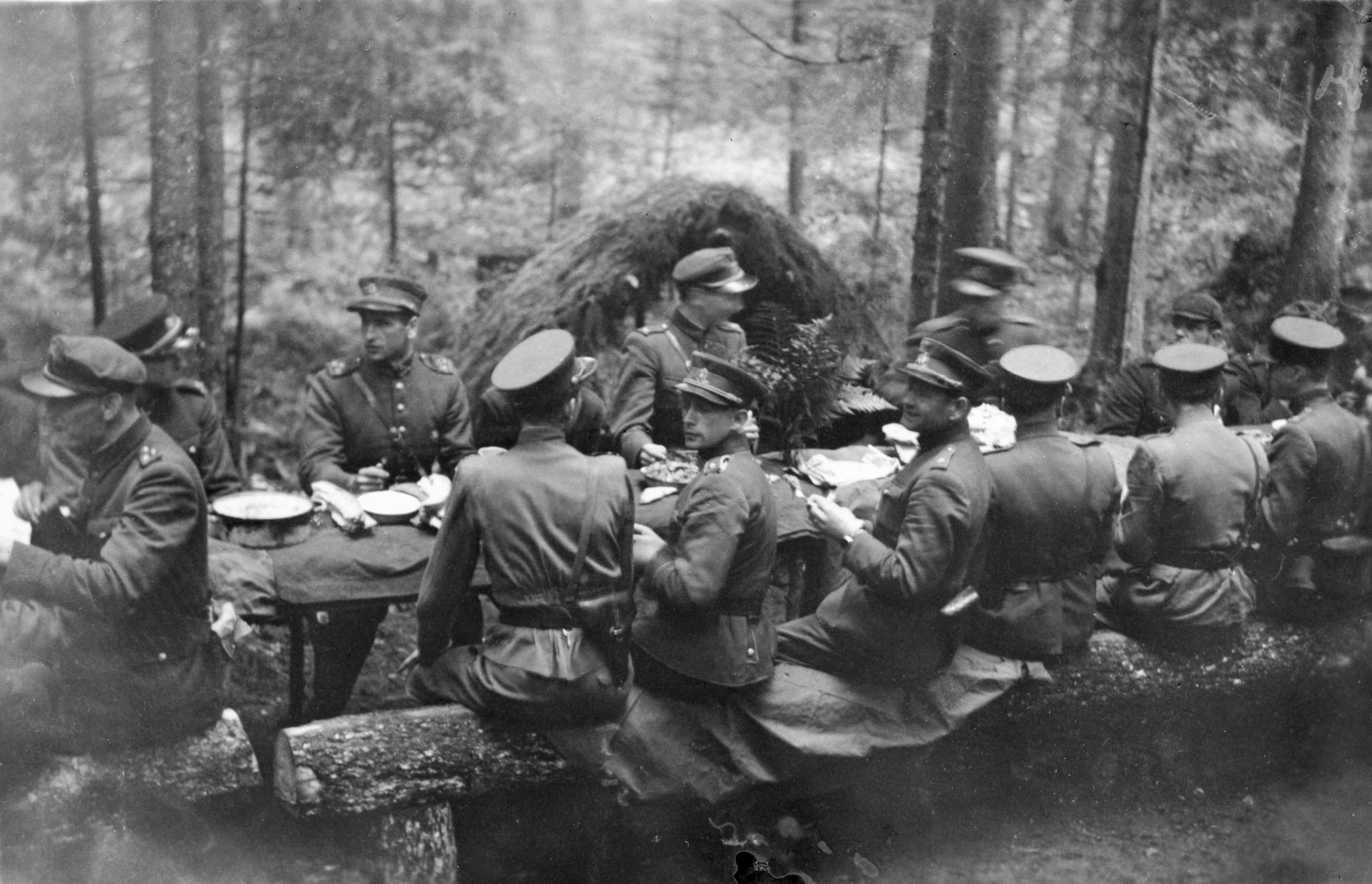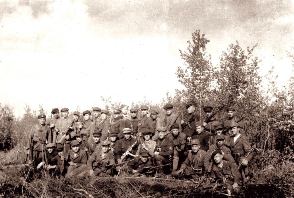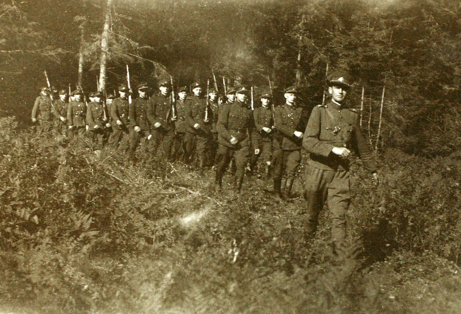 Priekyje žygiuoja – Žalgirio rinktinės štabo viršininkas Pranas Runas-Daugirdas. Kazlų Rūdos miškas.