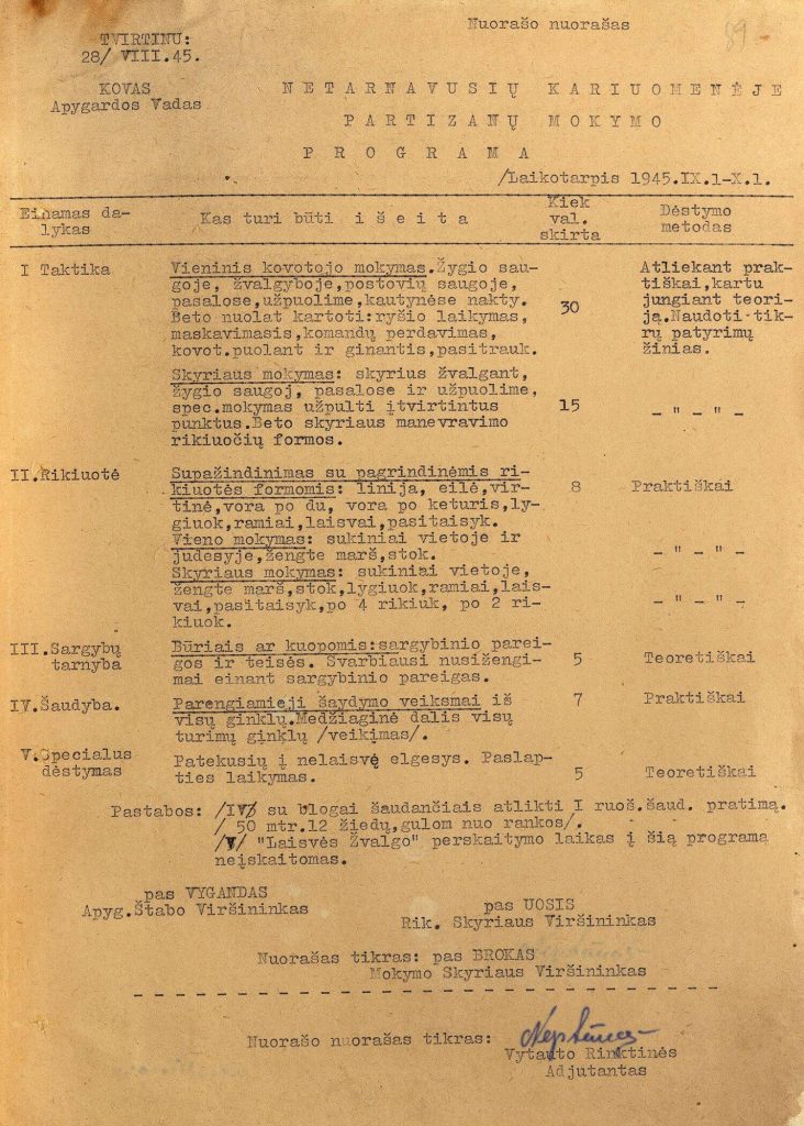 Tauro apygardos štabo parengta kariuomenėje netarnavusių partizanų mokymo programa. Patvirtina 1945 m. rugpjūčio 28 d.