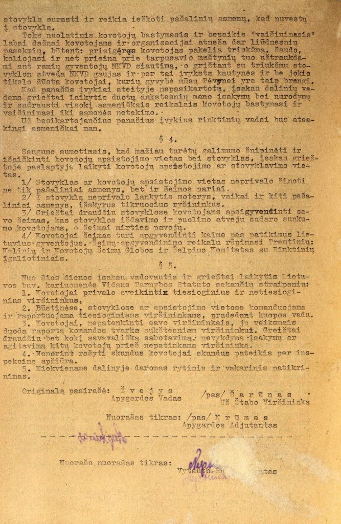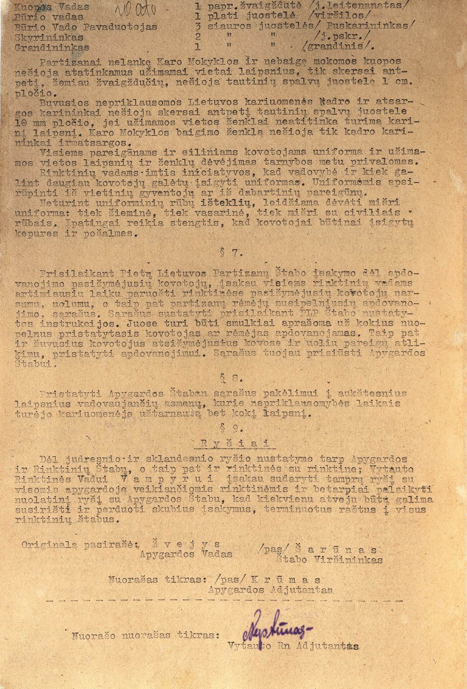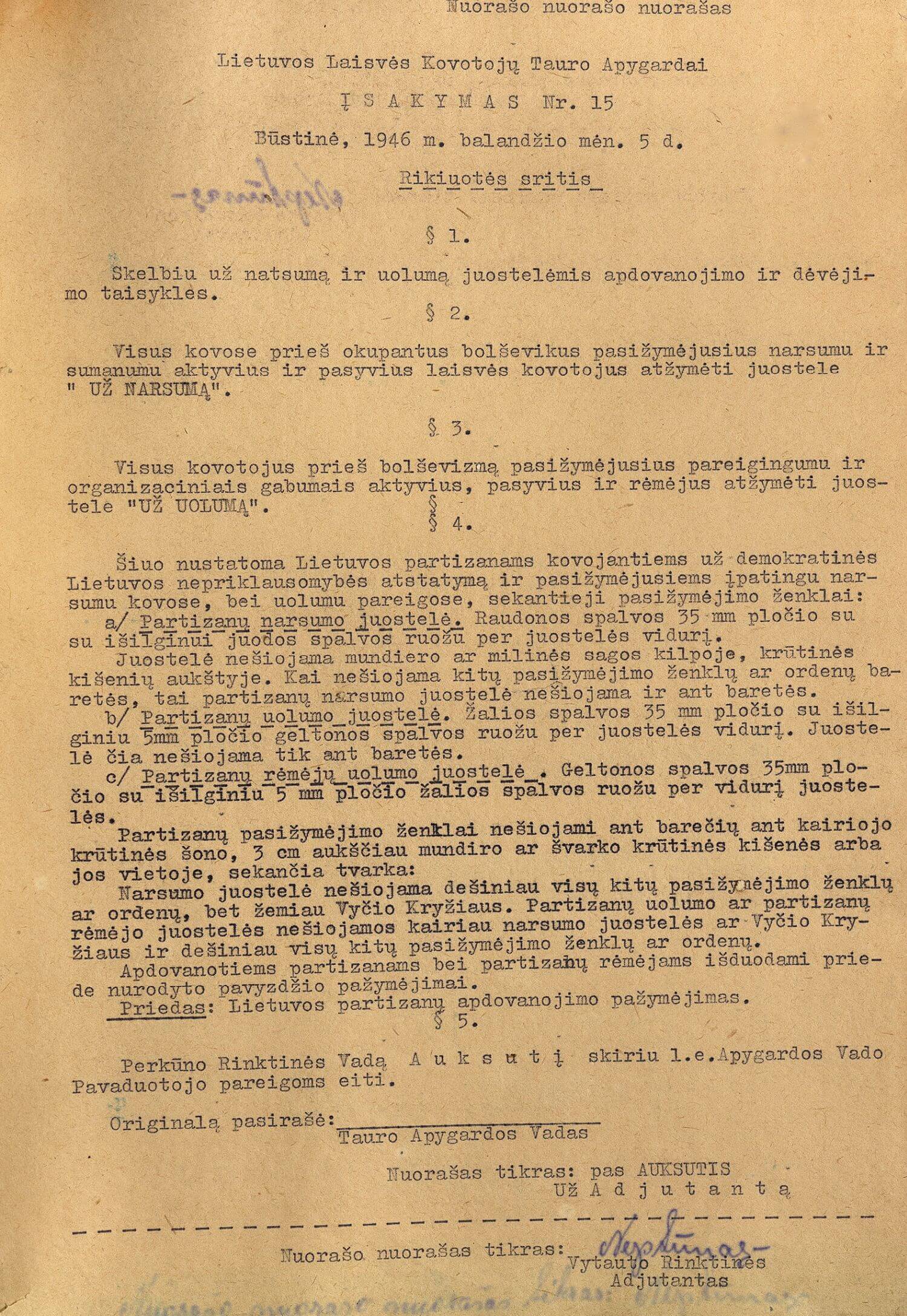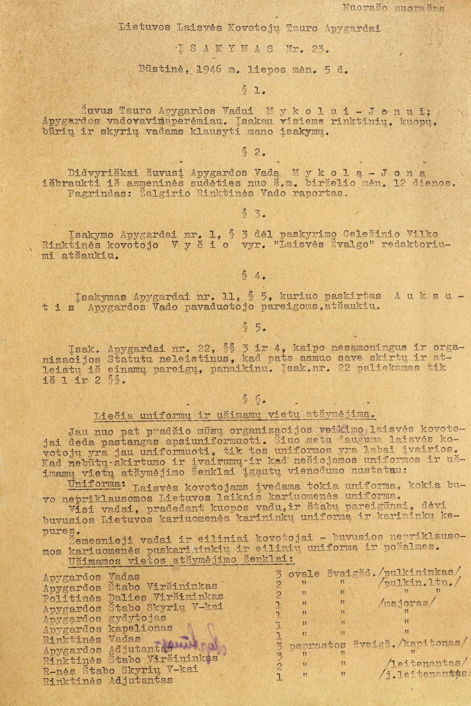 Tauro apygardos vado Antano Baltūsio-Žvejo 1946 m. liepos 5 d. įsakymas, kuriame informuojama apie apygardos vado pasikeitimą, partizanų uniformų dėvėjimo tvarką, apdovanotinų partizanų ir rėmėjų sąrašų sudarymą ir kt.