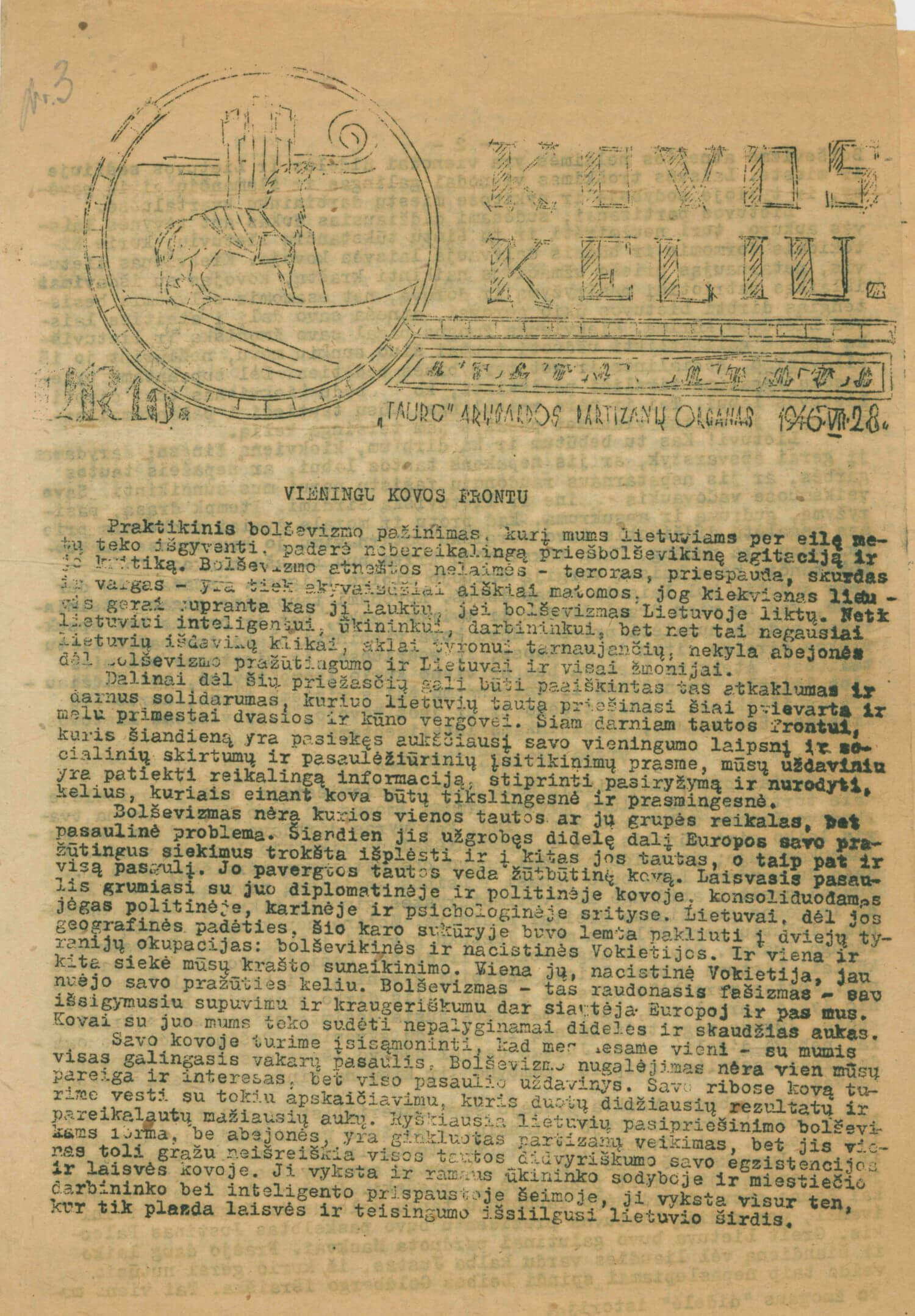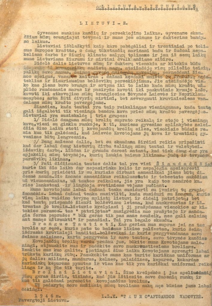 Tauro apygardos vadovybės kreipimasis į tautiečius, raginantis remti Lietuvos partizanus. 1946 m.