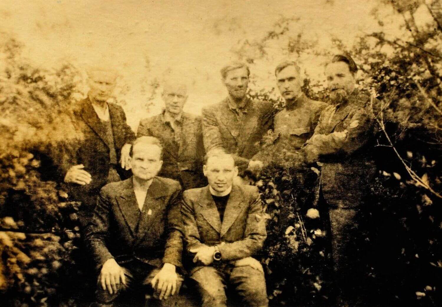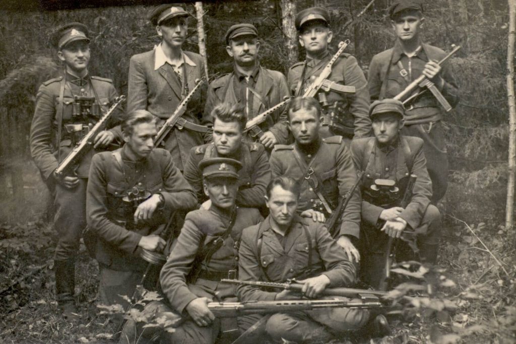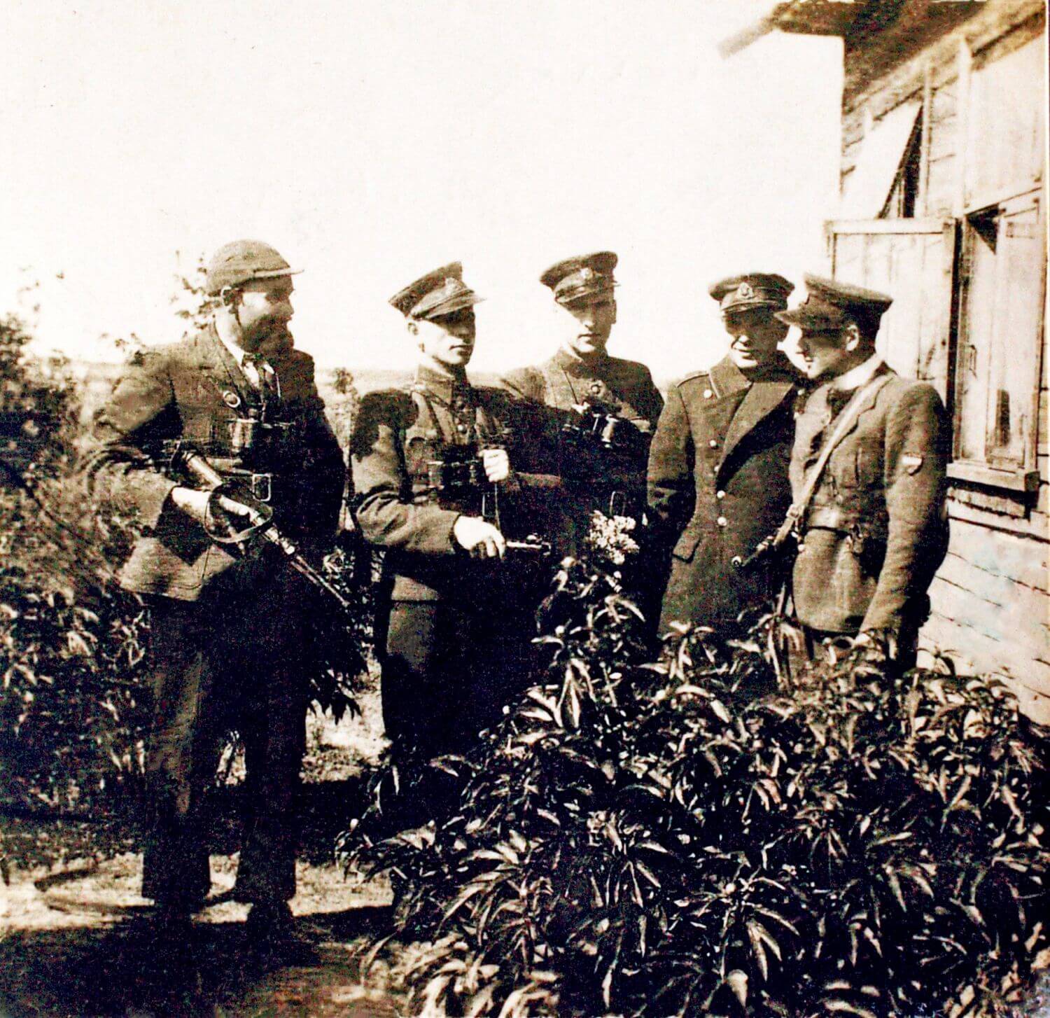 Stovi iš kairės: Jonas Pileckis-Brokas, Vytautas (Vitalius) Gavėnas-Vampyras, Antanas Baltūsis-Žvejys, Vaclovas Navickas-Auksutis, apygardos kapelionas Justinas Lelešius-Grafas.