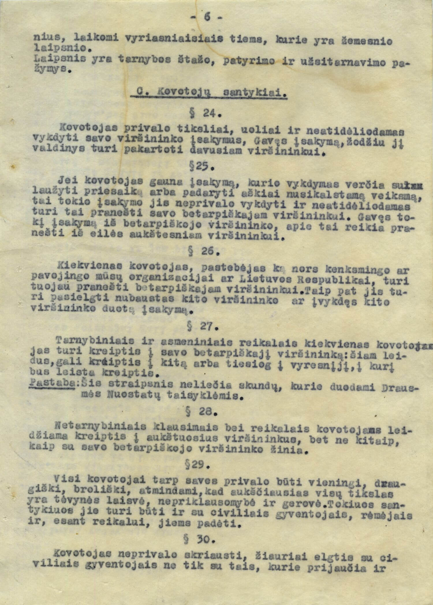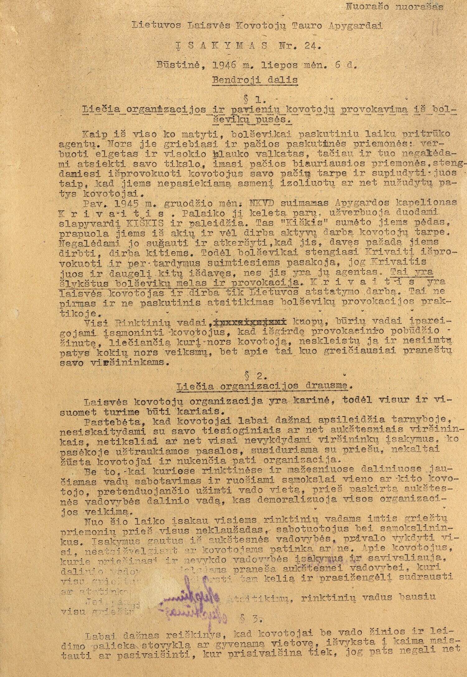 Tauro apygardos vado Antano Baltūsio-Žvejo 1946 m. liepos 6 d. įsakymas dėl kovotojų veiksmų reaguojant į priešo provokacijas, tarnybinės drausmės laikymosi, neleistinumo viešinti žinias apie kovotojų apsistojimo ar stovyklavimo vietas, kovotojų bendravimo su savo tiesioginiais ir netiesioginiais viršininkais ir kt.