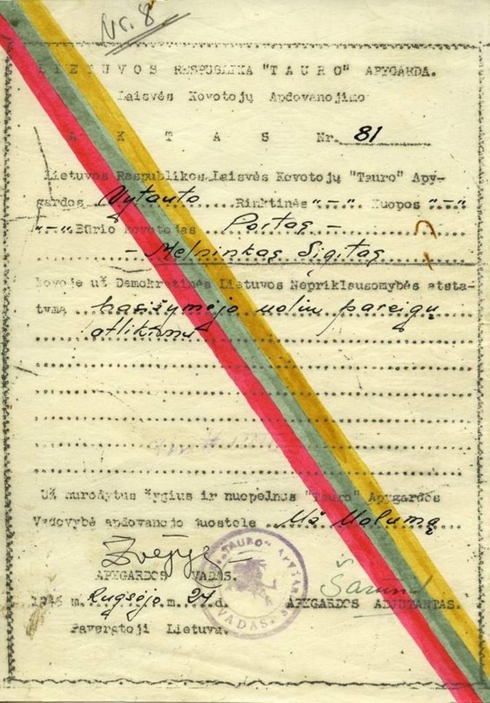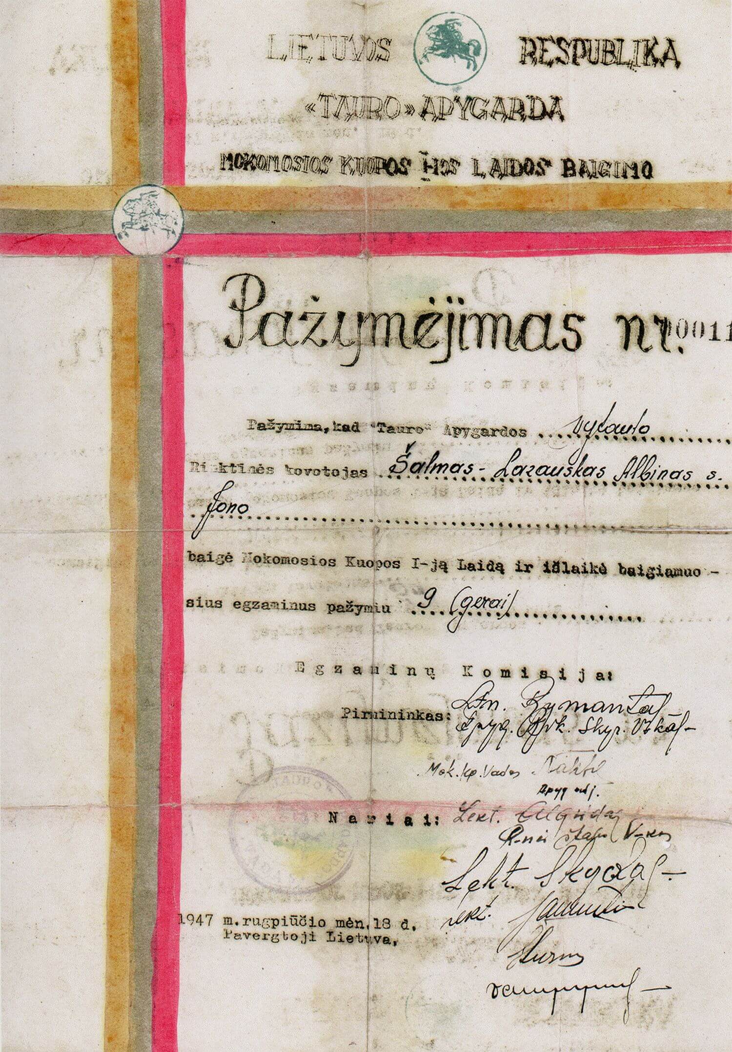Tauro apygardos Pirmosios mokomosios kuopos baigimo pažymėjimas išduotas Vytauto rinktinės partizanui Albinui Lazauskui-Šalmui kursų baigimo proga. 1947 m. rugpjūčio 18 d.