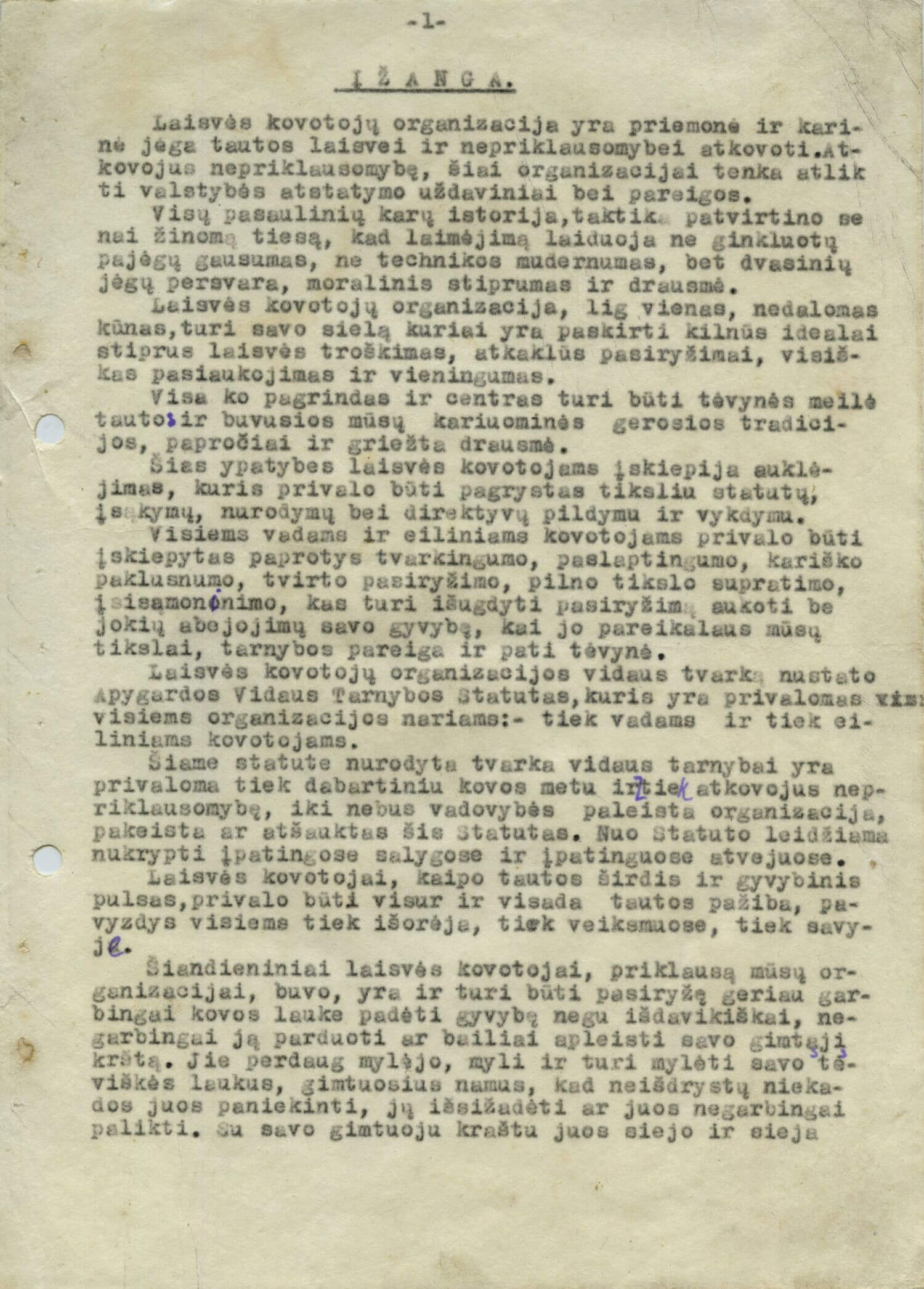 Statuto įvade rašoma: „Laisvės kovotojų organizacijos vidaus tvarką nustato apygardos „Vidaus tarnybos statutas“, kuris yra privalomas visiems organizacijos nariams: tiek vadams, tiek eiliniams kovotojams. Šiame Statute nurodyta tvarka vidaus tarnybai yra privaloma tiek dabartiniu kovos metu ir tiek atkovojus Nepriklausomybę, iki nebus vadovybės paleista organizacija, pakeistas ar atšauktas šis Statutas. Nuo Statuto leidžiama nukrypti ypatingose sąlygose ir ypatingose atvejuose. Laisvės kovotojai, kaip tautos širdis ir gyvybinis pulsas, privalo būti visur ir visada tautos pažiba, pavyzdys visiems tiek išorėje, tiek veiksmuose, tiek savyje.“