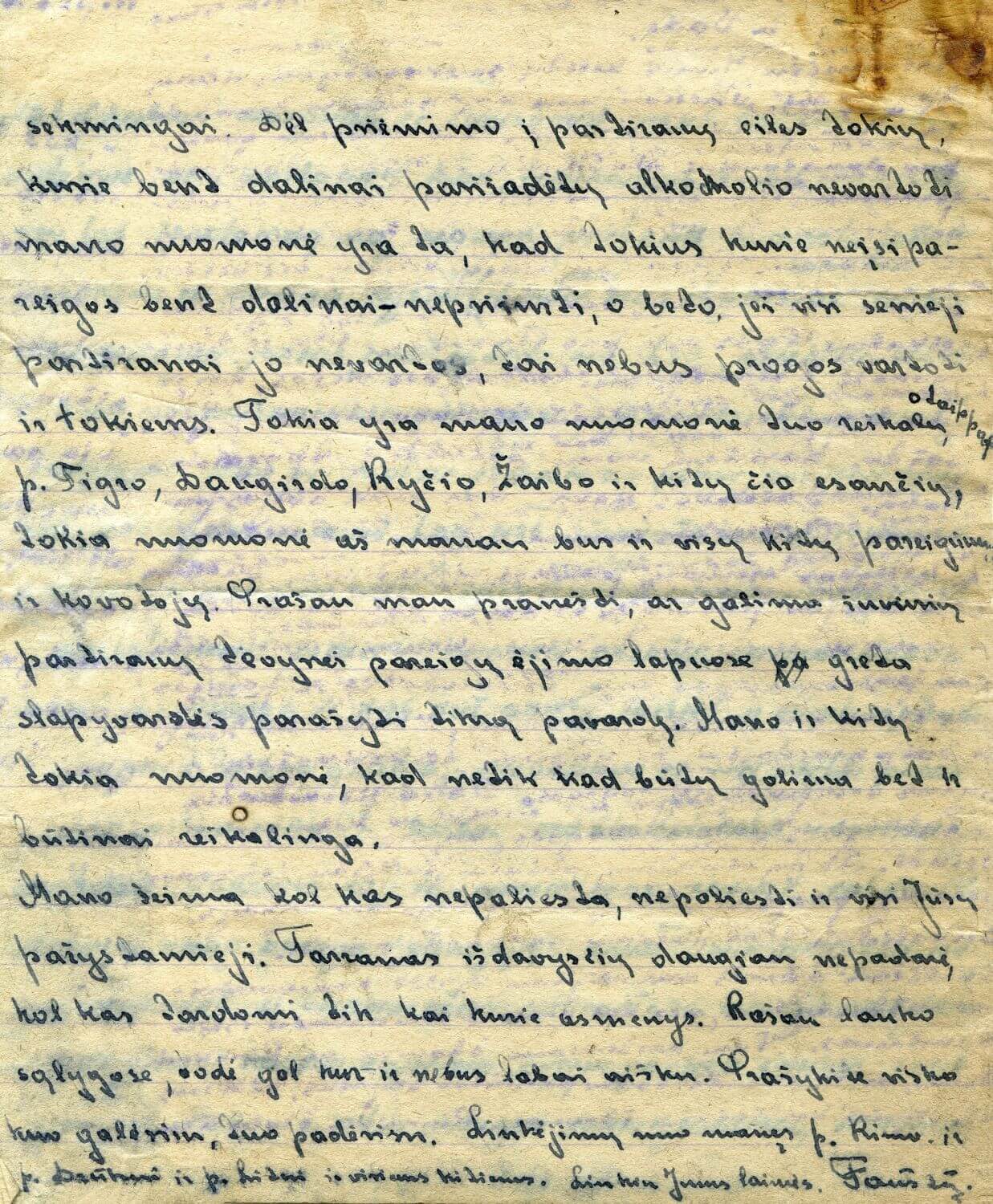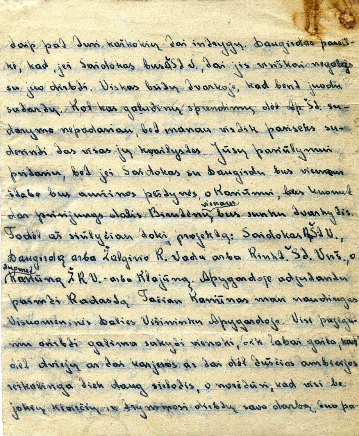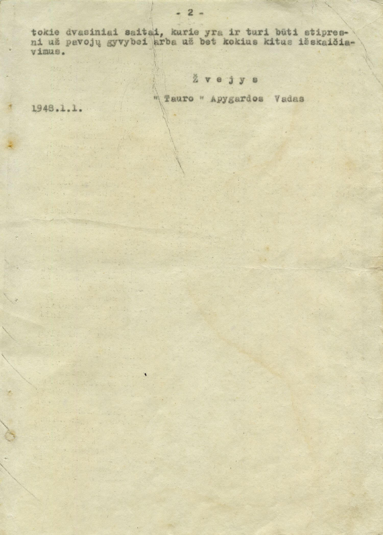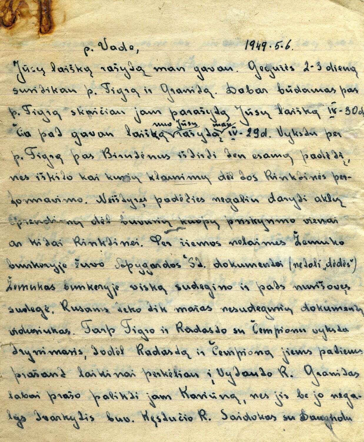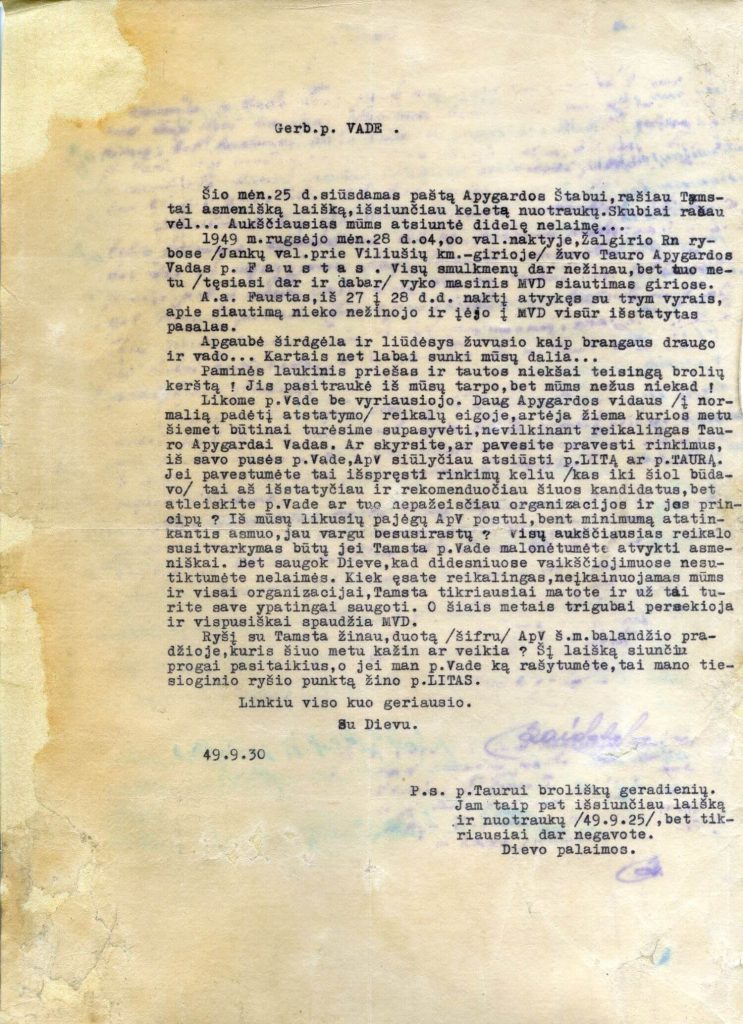 Tauro apygardos vado Aleksandro Grybino-Fausto rašytas laiškas Pietų Lietuvos (Nemuno) srities vadui Adolfui Ramanauskui-Vanagui apie padėtį apygardoje. 1949 m. gegužės 6 d.