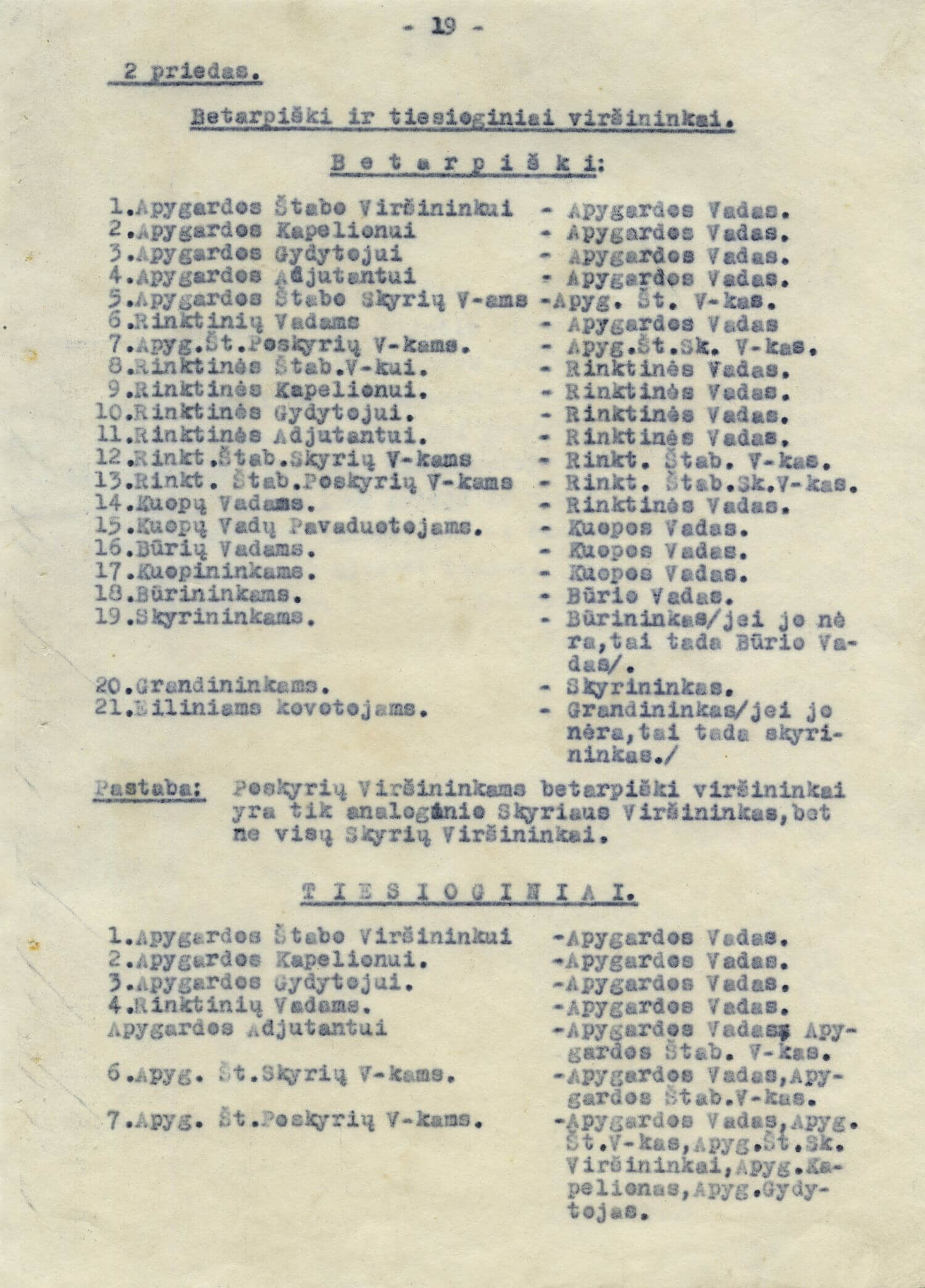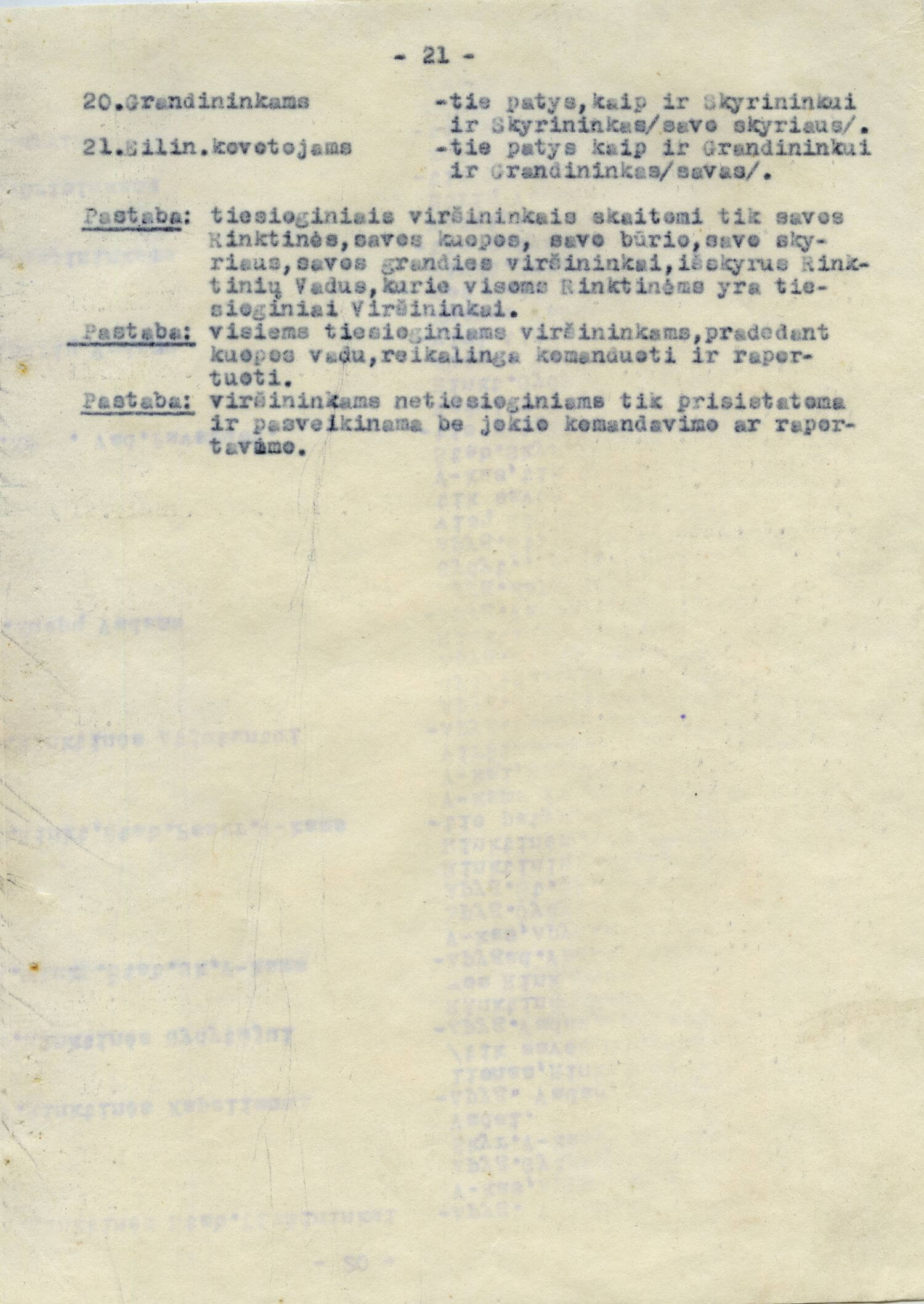 Įsakyme Nr. 21 Tauro apygardos vadas skelbia apie Mokomosios kuopos prie Tauro apygardos štabo įsteigimą, kuopos vado ir lektorių paskyrimą, kuopos kovotojų sąrašo paskelbimą ir kt.