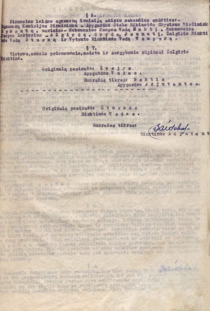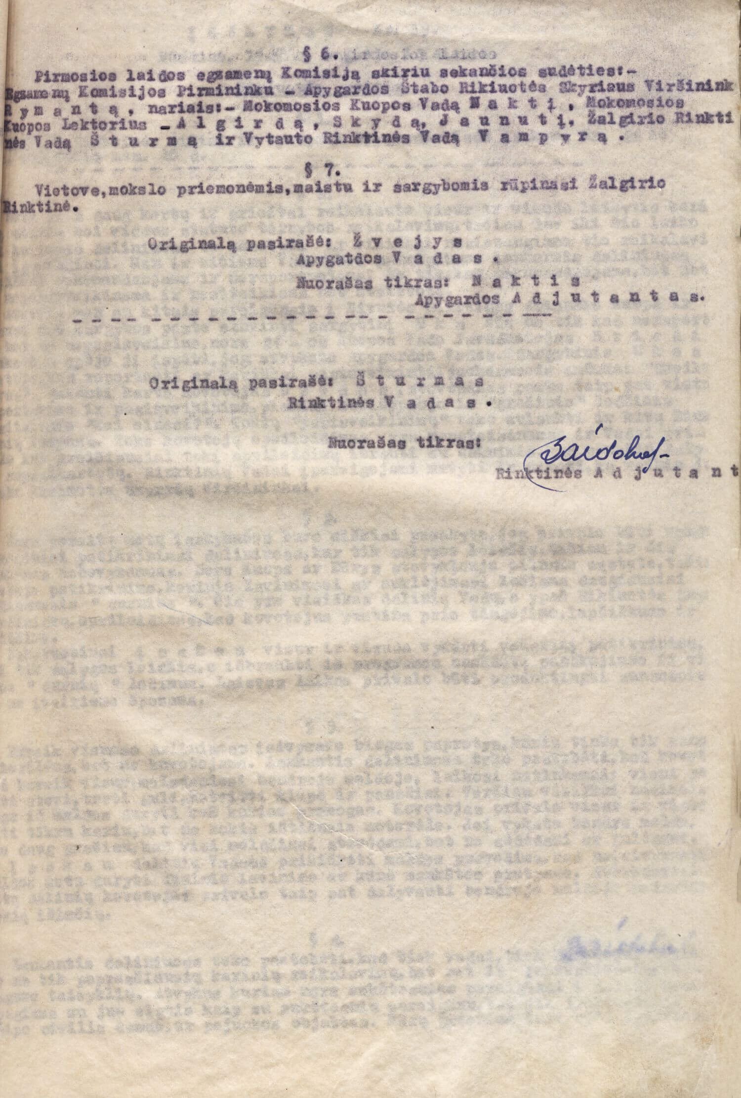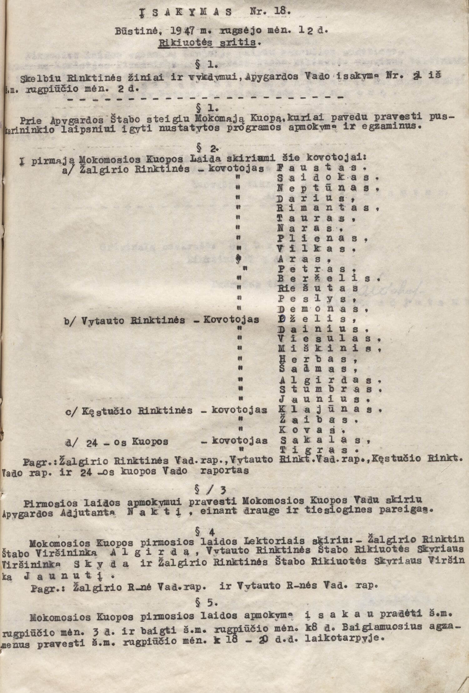 Tauro apygardos Žalgirio rinktinės vado Vinco Strimo-Šturmo įsakymas dėl apygardos vado Antano Baltūsio-Žvejo 1947 m. rugpjūčio 2 d. įsakymo Nr. 21 paskelbimo.