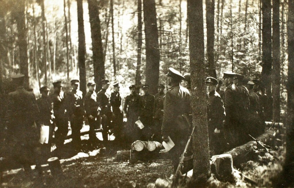 Vadai renkasi tribūnoje prieš prasidedant mokomosios kuopos paradui. Kazlų Rūdos miškas, 1947 m. rugpjūčio 20 d.