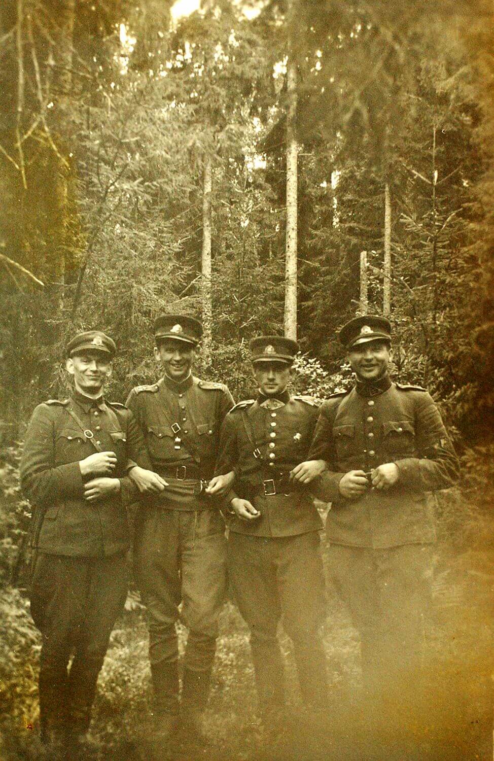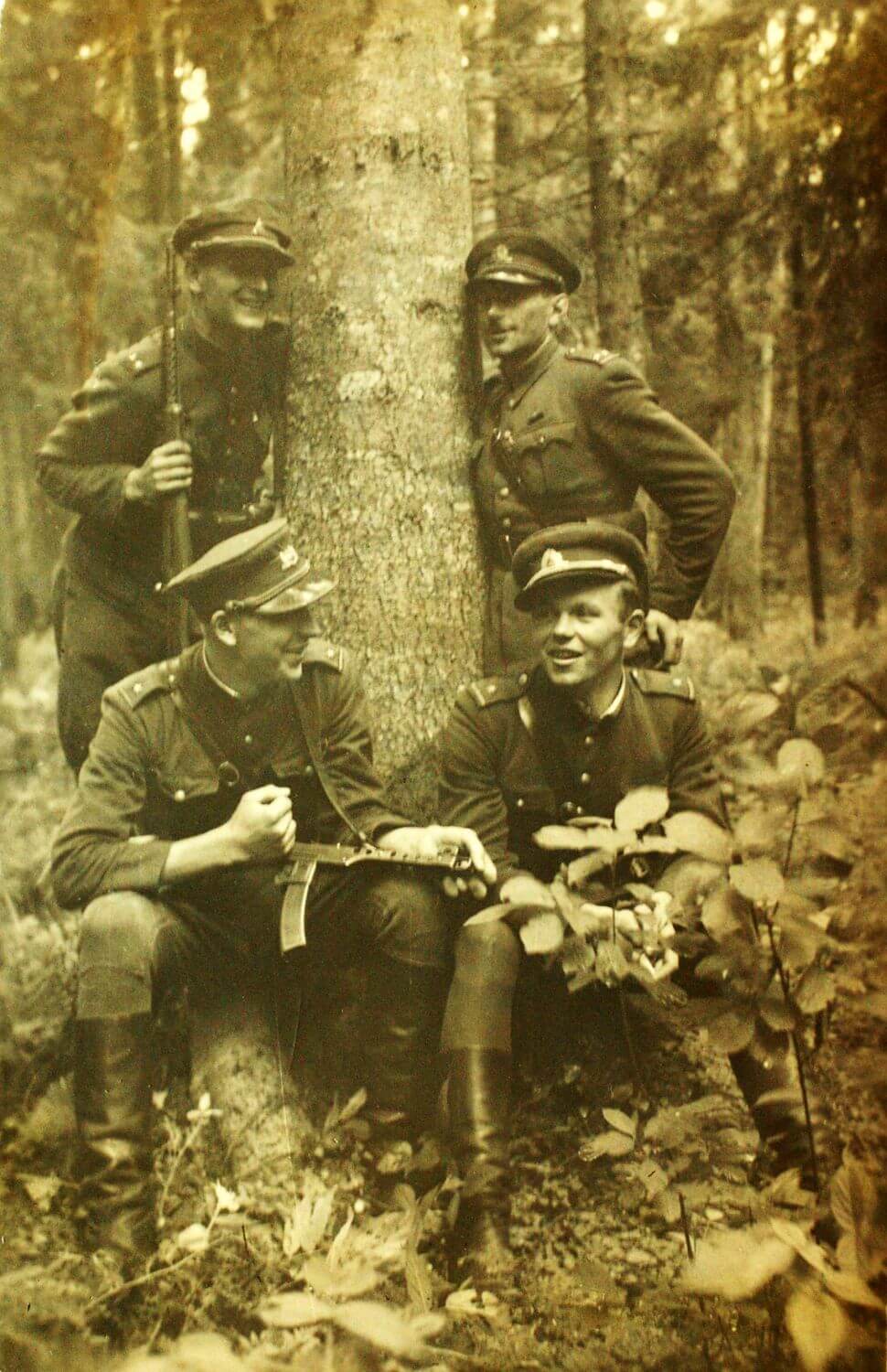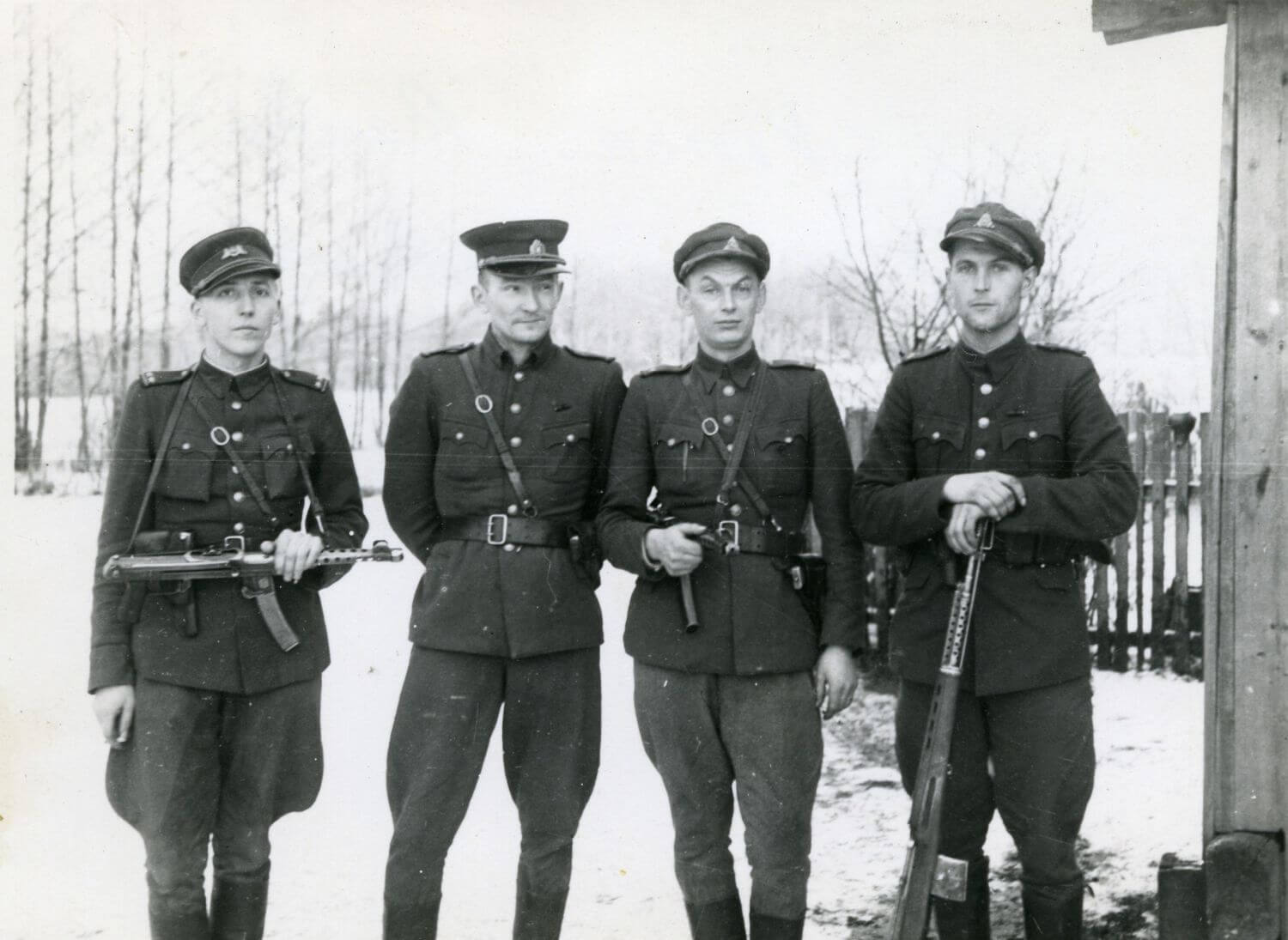 Tauro apygardos partizanai. Iš kairės: pirmas – Viktoras Vitkauskas-Saidokas, antras – Vincas Strimas-Šturmas, trečias – Jonas Kuras-Jaunutis, ketvirtas – Aleksandras Grybinas-Faustas. Ne vėliau 1948 m.
