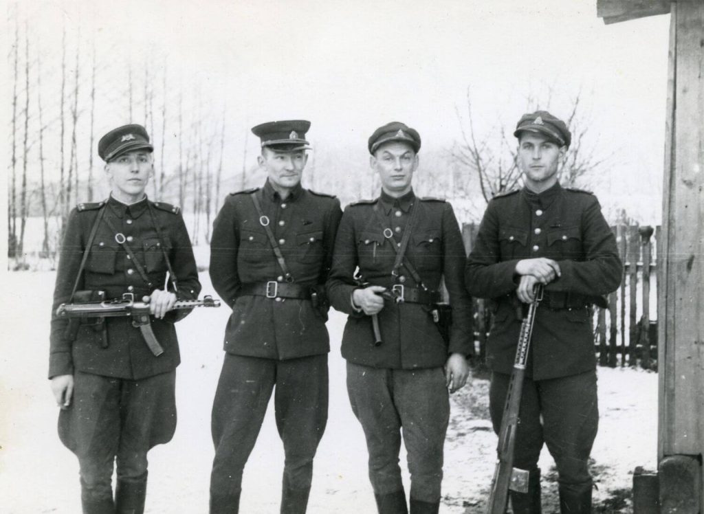 Stovi iš kairės: Žalgirio rinktinės štabo Rikiuotės skyriaus viršininkas Jonas Kuras-Jaunutis ir šios rinktinės štabo viršininkas Pranas Runas-Algirdas, kuopos vadas ir apygardos adjutantas Vytautas Jonas Jesaitis-Naktis, Vytauto rinktinės štabo Rikiuotės skyriaus viršininkas Jurgis Vasiliauskas-Skydas.
