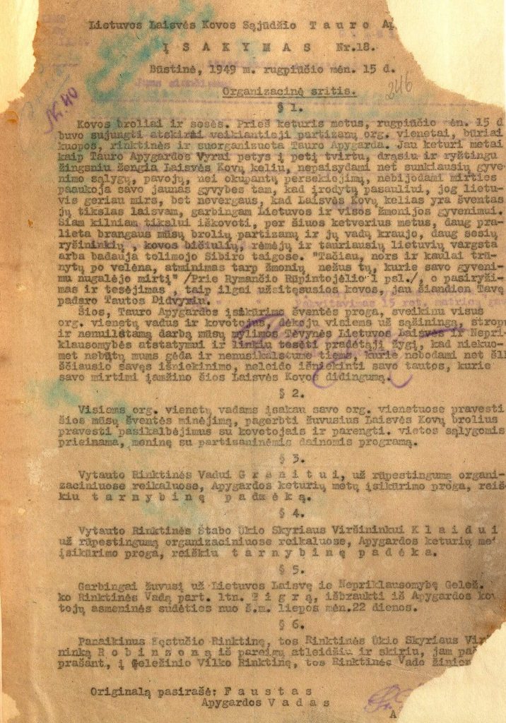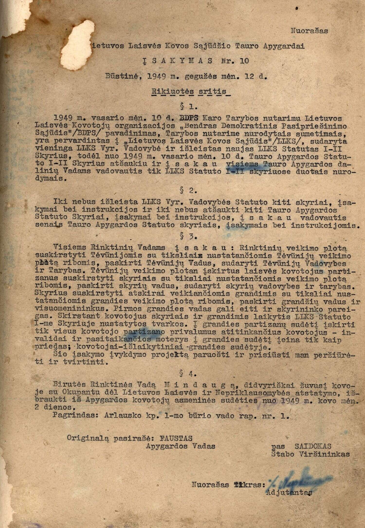 Tauro apygardos vado Aleksandro Grybino-Fausto 1949 m. gegužės 12 d. įsakymas dėl Bendrojo demokratinio pasipriešinimo sąjūdžio (BDPS) Karo tarybos 1949 m. vasario 10 d. nutarimo BDPS pavadinti Lietuvos laisvės kovos sąjūdžiu (LLKS), vadovavimosi LLKS statuto I-II skyrių nuostatomis, rinktinių veikimo teritorijos suskirstymo į tėvūnijas ir kt.