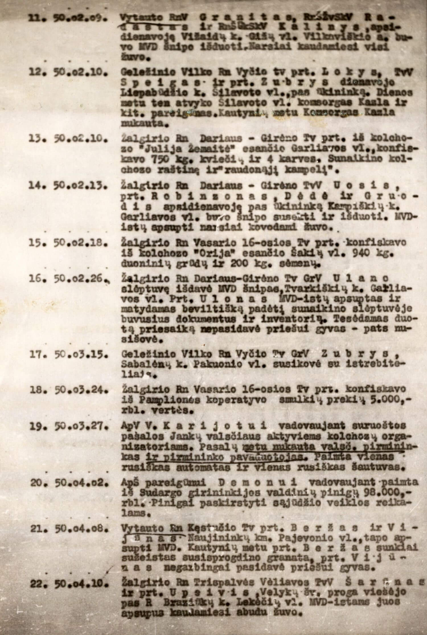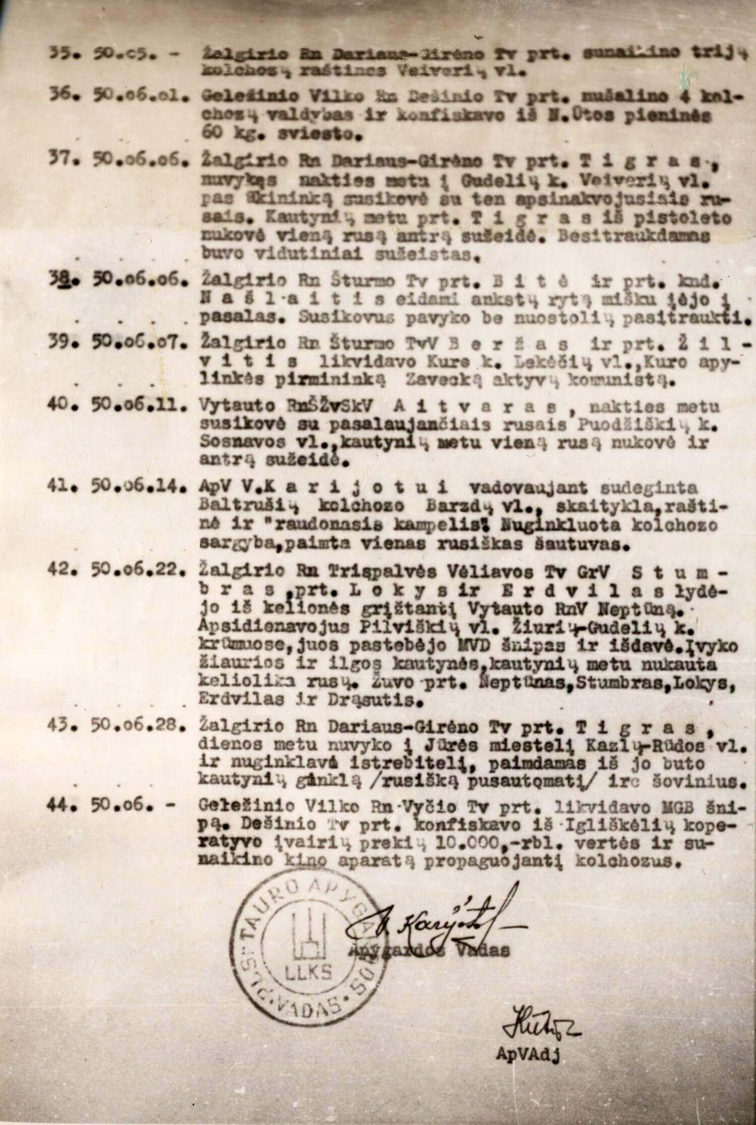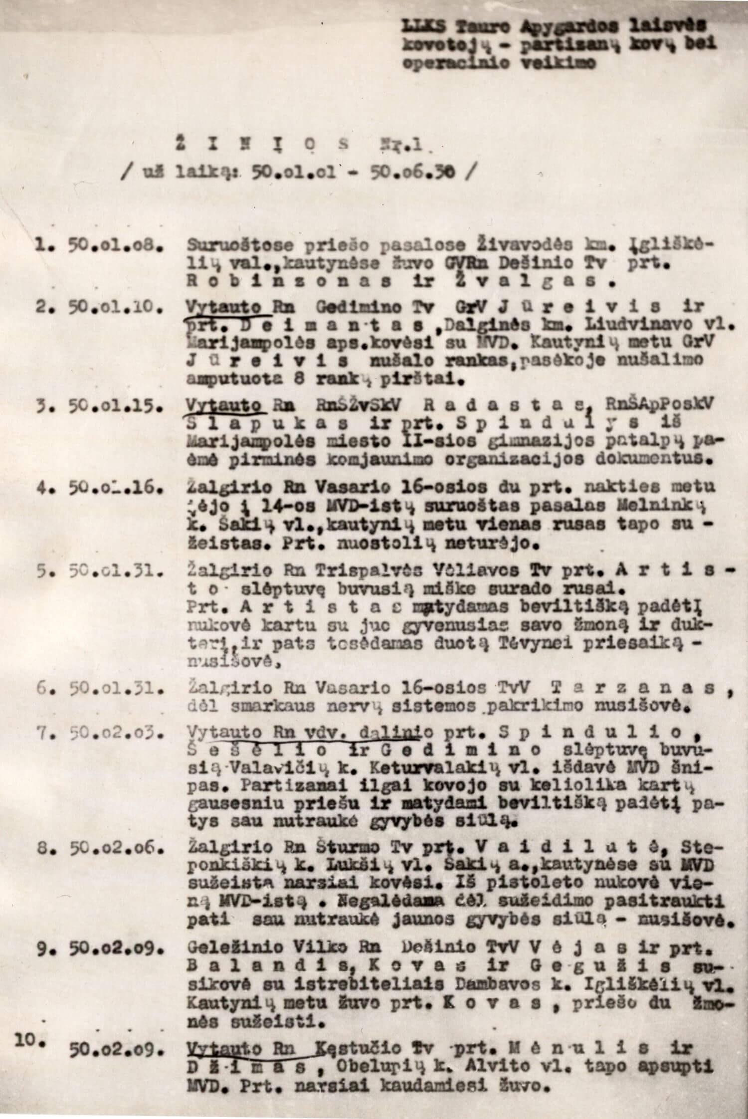 Tauro apygardos vado Viktoro Vitkausko-Karijoto sudarytos apygardos partizanų kovų bei operacijų 1950 m. sausio 8–birželio 28 d. žinios.