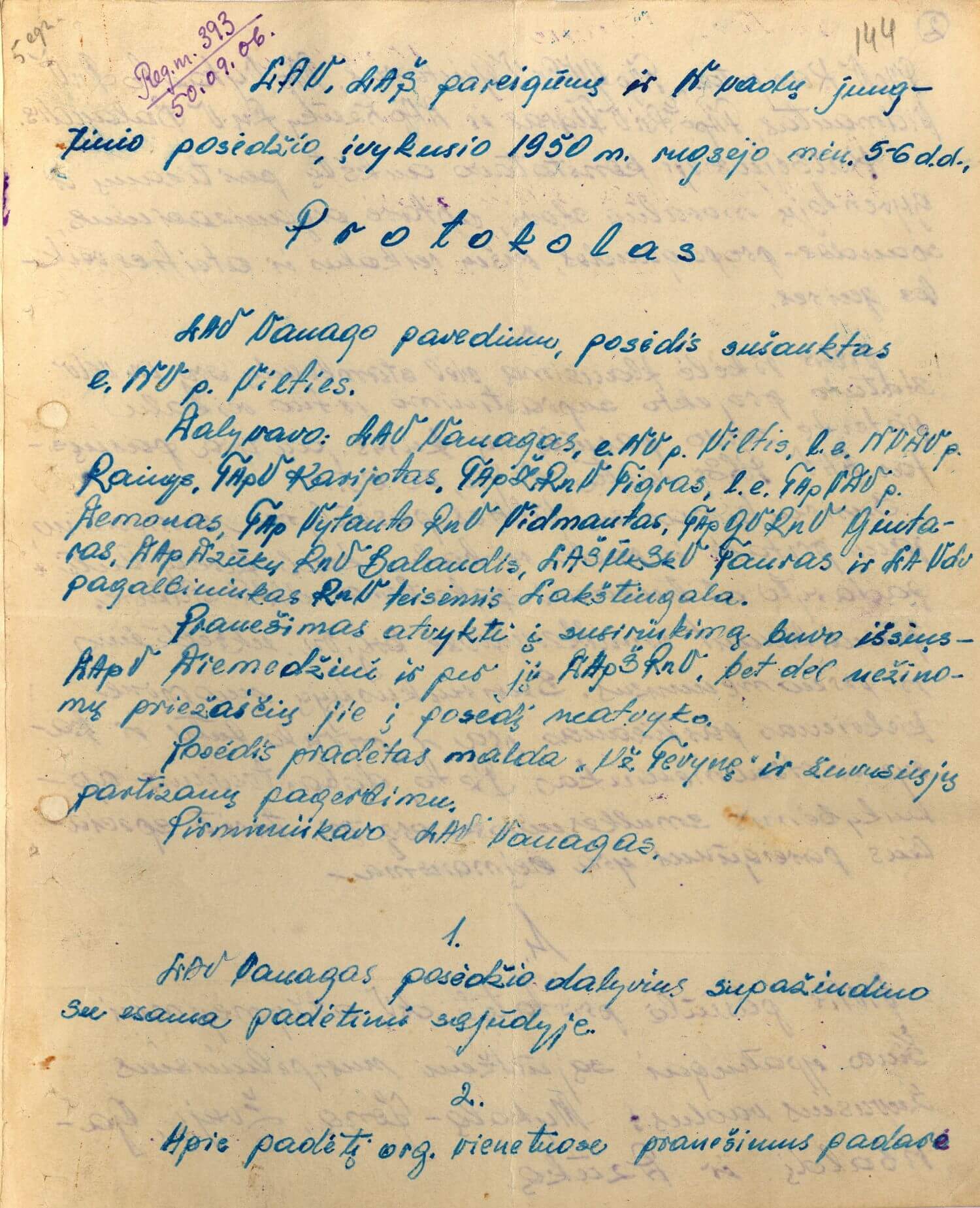 Lietuvos Laisvės Kovos Sąjūdžio (LLKS) Gynybos pajėgų vado, Gynybos pajėgų štabo pareigūnų ir Pietų Lietuvos srities vadų 1950 m. rugsėjo 5−6 d. jungtinio posėdžio protokolas.