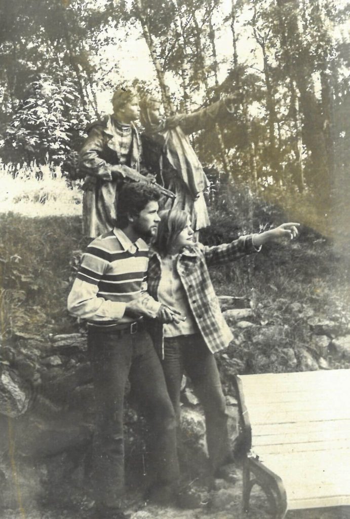 Hippie and pioneer of Lithuanian underground rock culture Alvitas Taunys-Guru (1949–1979) and his wife Dangė Širvytė, daughter of the poet Pauliaus Širvys, mimicking the socialist realism Soviet partisans sculpture. Taunys was one of the organisers of the rock festival at the Žirmūnai restaurant in Vilnius that was held on 26 April 1970 and was the first of its kind in Lithuania. He was expelled from the Vilnius Civil Engineering Institute for two years. He died in 1979 under suspicious circumstances.
