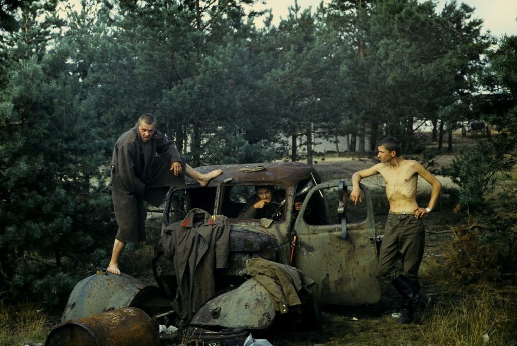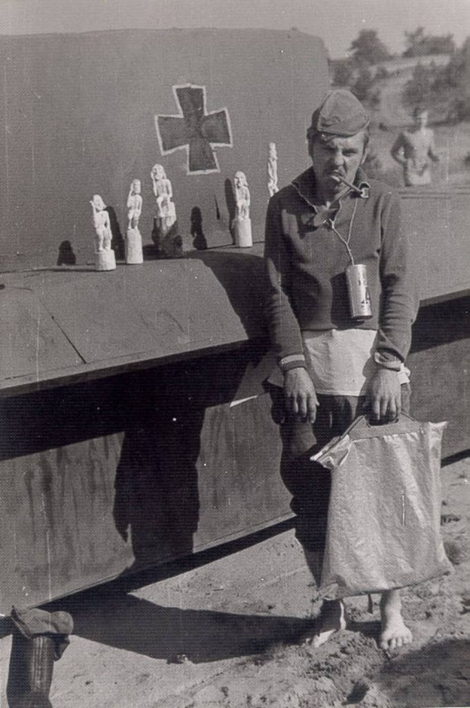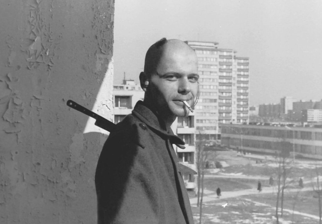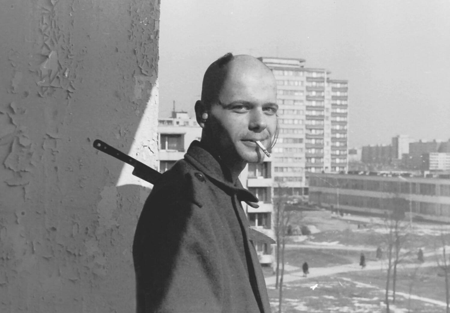 Gitenis Umbrasas on the balcony of a Soviet apartment block, just before the March 13 celebration of Cockroach Day – a happening organized by Gitenis and his friends in the streets of Vilnius Old Town as a theatrical protest against the dullness of everyday life. For his role, the artist sewed a wooden board with a cut and a broken knife handle onto the back of a military overcoat, and placed another slit with the knife’s tip protruding from the chest. He shaved his head, leaving a few lonely braids – creating the perfect image of a “žertva” (victim) of the era.