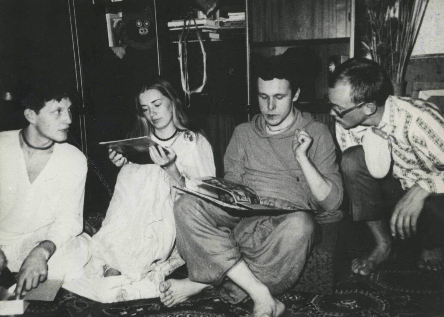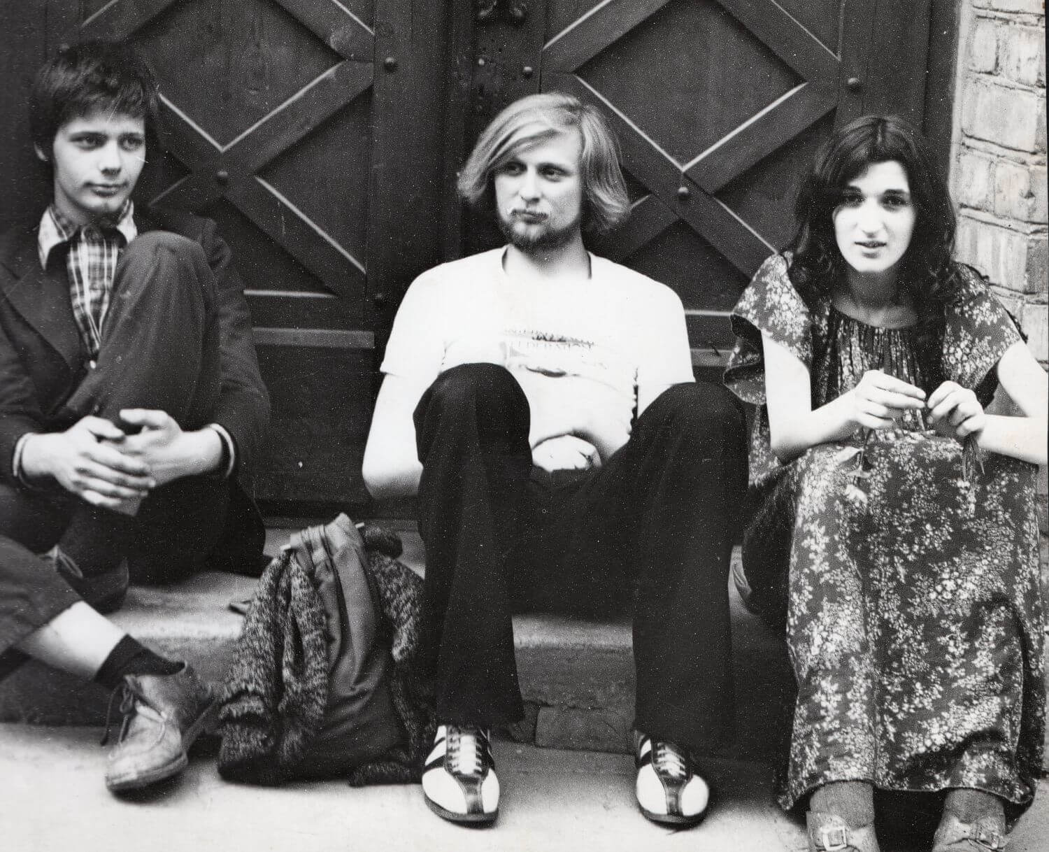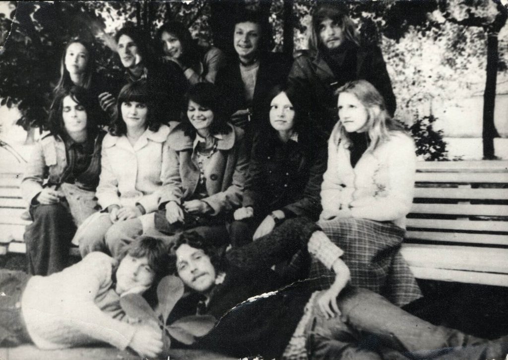 Hippie-style Vilnius youth with guests from Latvia and Estonia. In the front row on the right lies poet Raimundas (Rimas) Burokas (1953–1980), a free spirit of the Old Town who died in 1980 at the Lukiškės Prison hospital. In the second row, third from the left – his wife Silvija Vilytė-Burokienė. In the third row, fourth from the left – poet Edmondas Kelmickas.