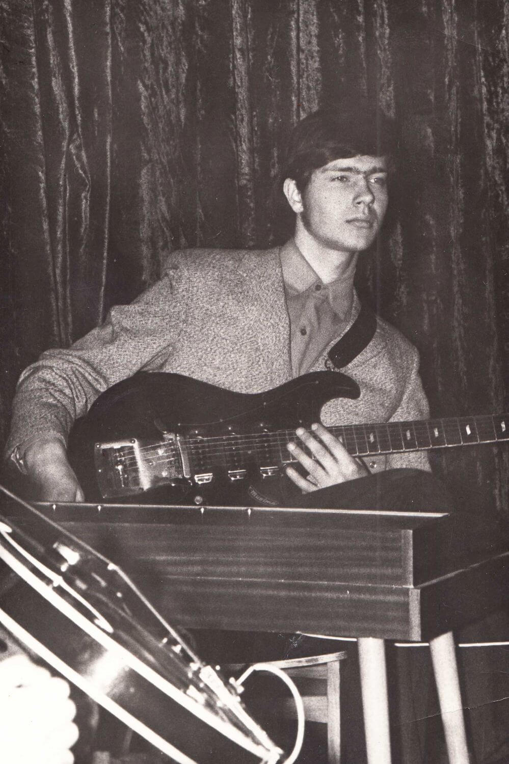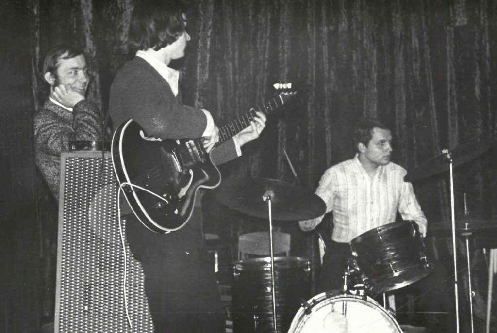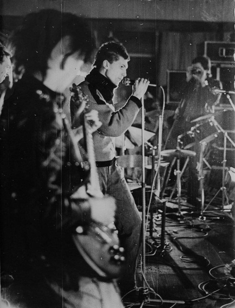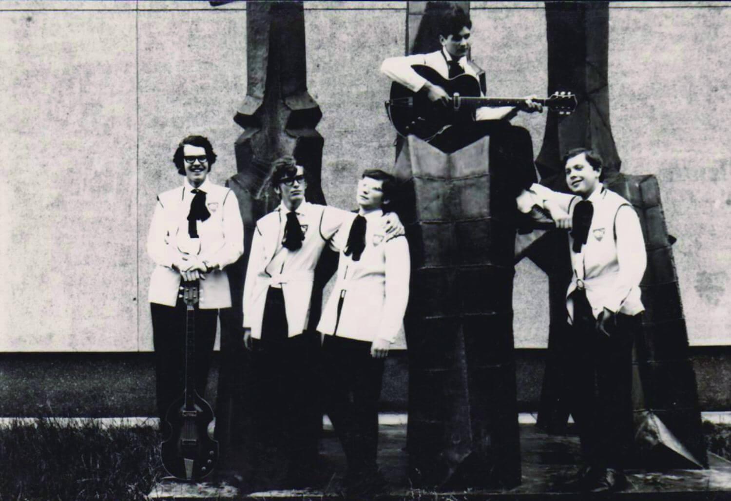 Rock band Raganiai (“The Witches”) performing at the “Kaunas Pop Session” festival held in the Automation Faculty Hall of Kaunas Polytechnic Institute. From left: Natanas Gitkindas, Visvaldas Žalnierius, Anatolijus Goldšteinas, Vladimiras Kotčegarovas. After the festival, the authorities banned Raganiai from rehearsing in the hall of the Kaunas Polytechnic Institute and playing at student dances.