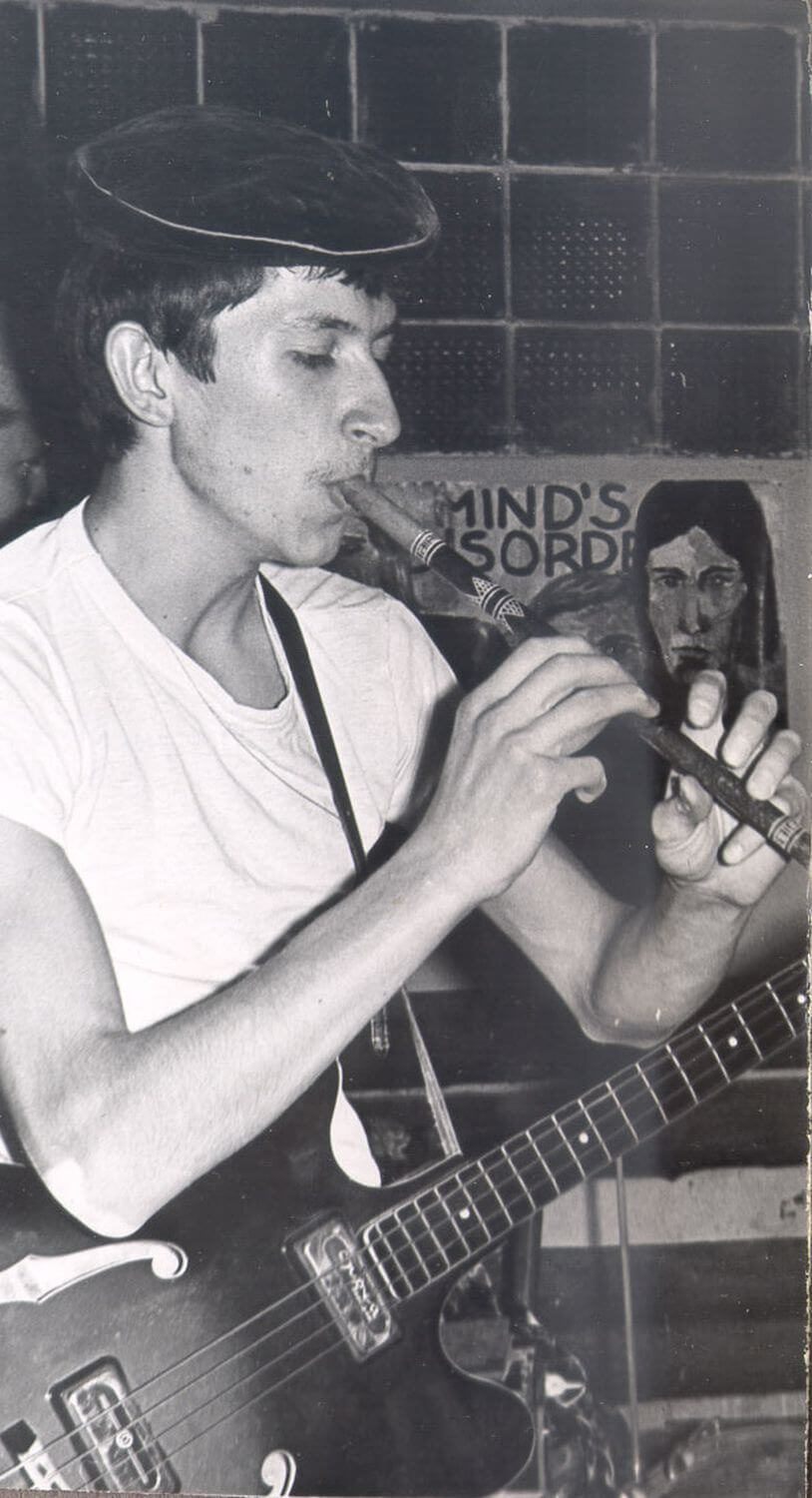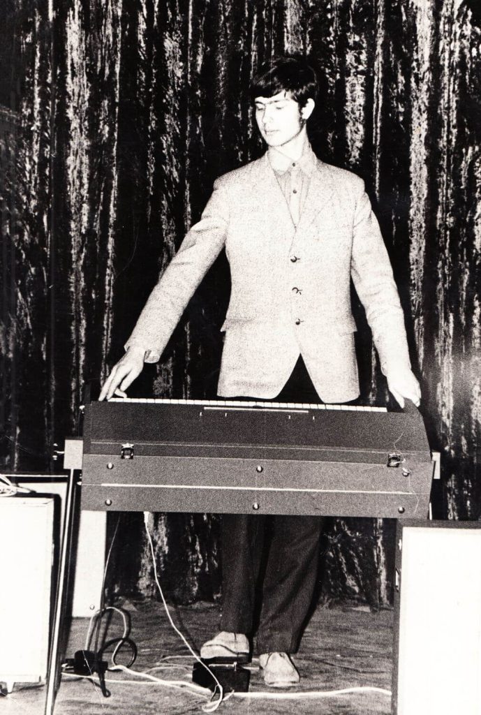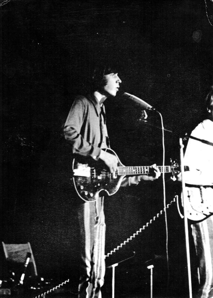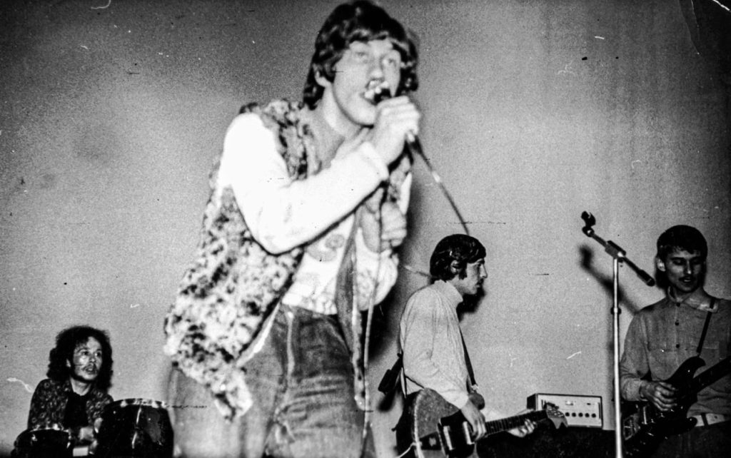 Rock band Raganiai (“The Witches”) performing at the “Kaunas Pop Session” festival held in the Automation Faculty Hall of Kaunas Polytechnic Institute. From left: Natanas Gitkindas, Visvaldas Žalnierius, Anatolijus Goldšteinas, Vladimiras Kotčegarovas. After the festival, the authorities banned Raganiai from rehearsing in the hall of the Kaunas Polytechnic Institute and playing at student dances.