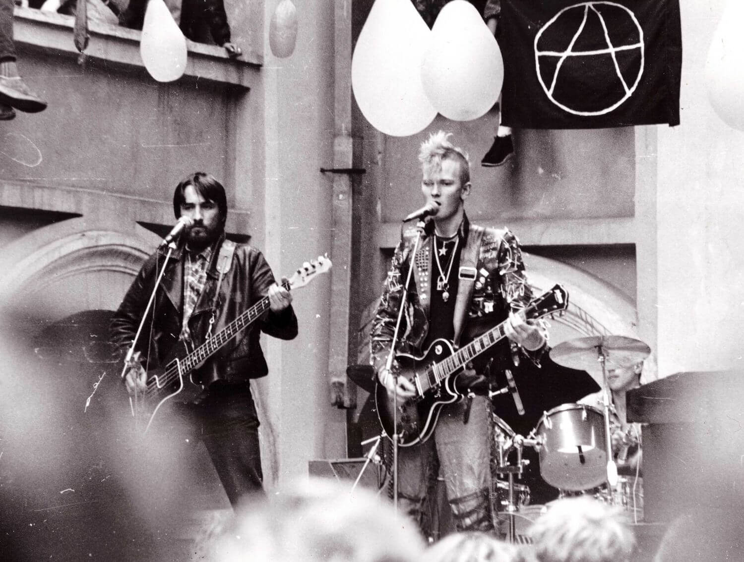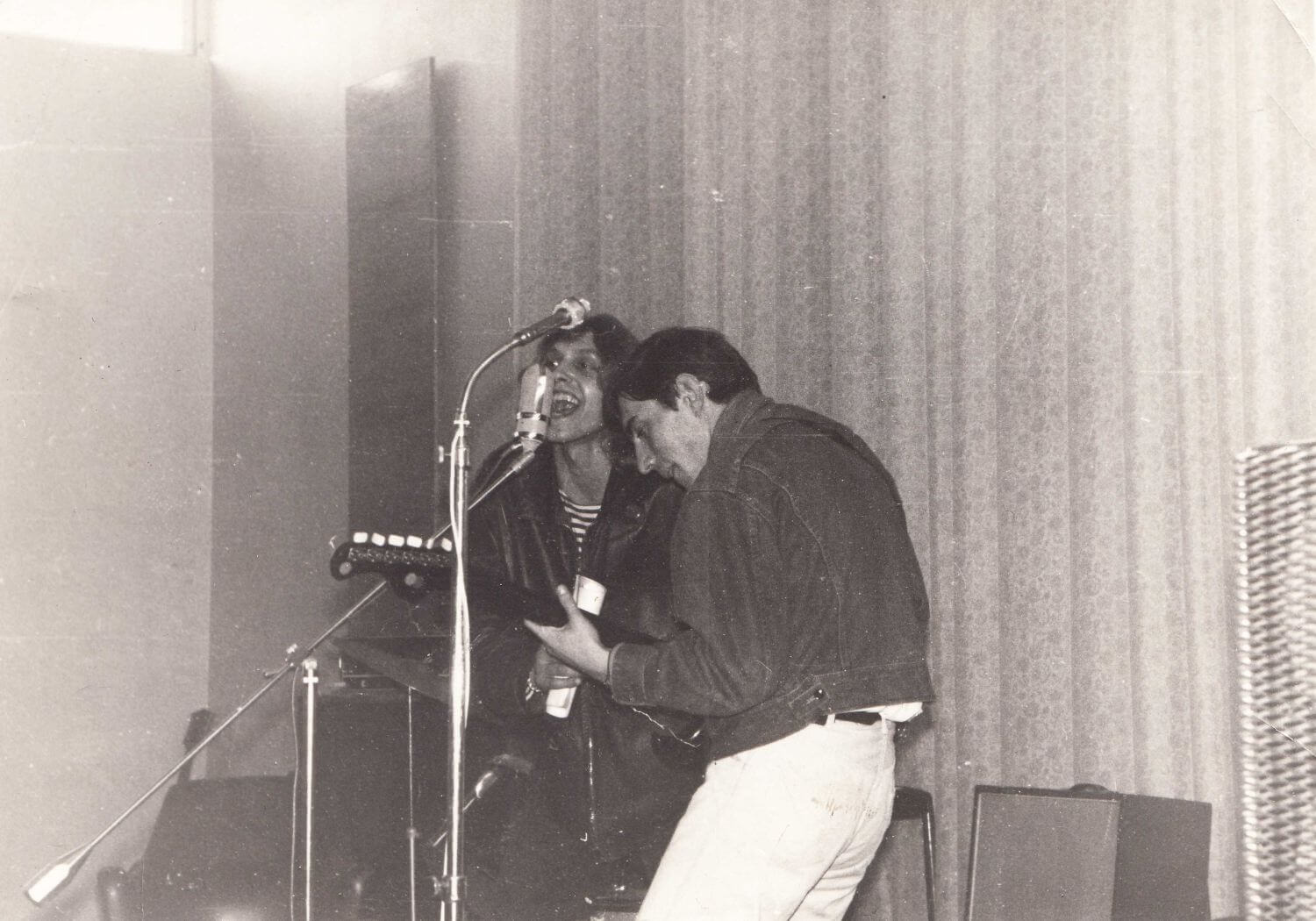 Rehearsal of the rock opera Jesus Christ Superstar. From left: Vidas Petkevičius, Rimas Jasenka, Donatas Janušas. In the opera, the apostle Simon the Zealot (Rimas Jasenka) called on the Jews to rise up against their oppressors.