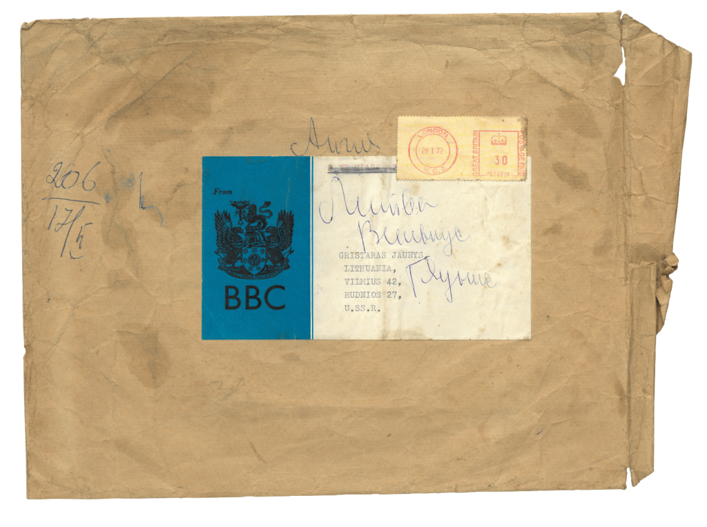 Envelope of a BBC Music Club package sent to Gintaras Taunys. The Taunys family home on Rudnios Street in Vilnius, dubbed the “house of unlocked doors” by the hippie community, was home to siblings Alvitas, Gintaras, and Arūnė, who corresponded with a BBC radio host and became members of the global BBC Music Club. They received BBC T-shirts as gifts. Passersby, puzzled by the unfamiliar logo on their shirts, decoded “BBC” in Soviet fashion as Военно-воздушные силы (“Air Force”). Postmark on the envelope: London, 28 January 1972