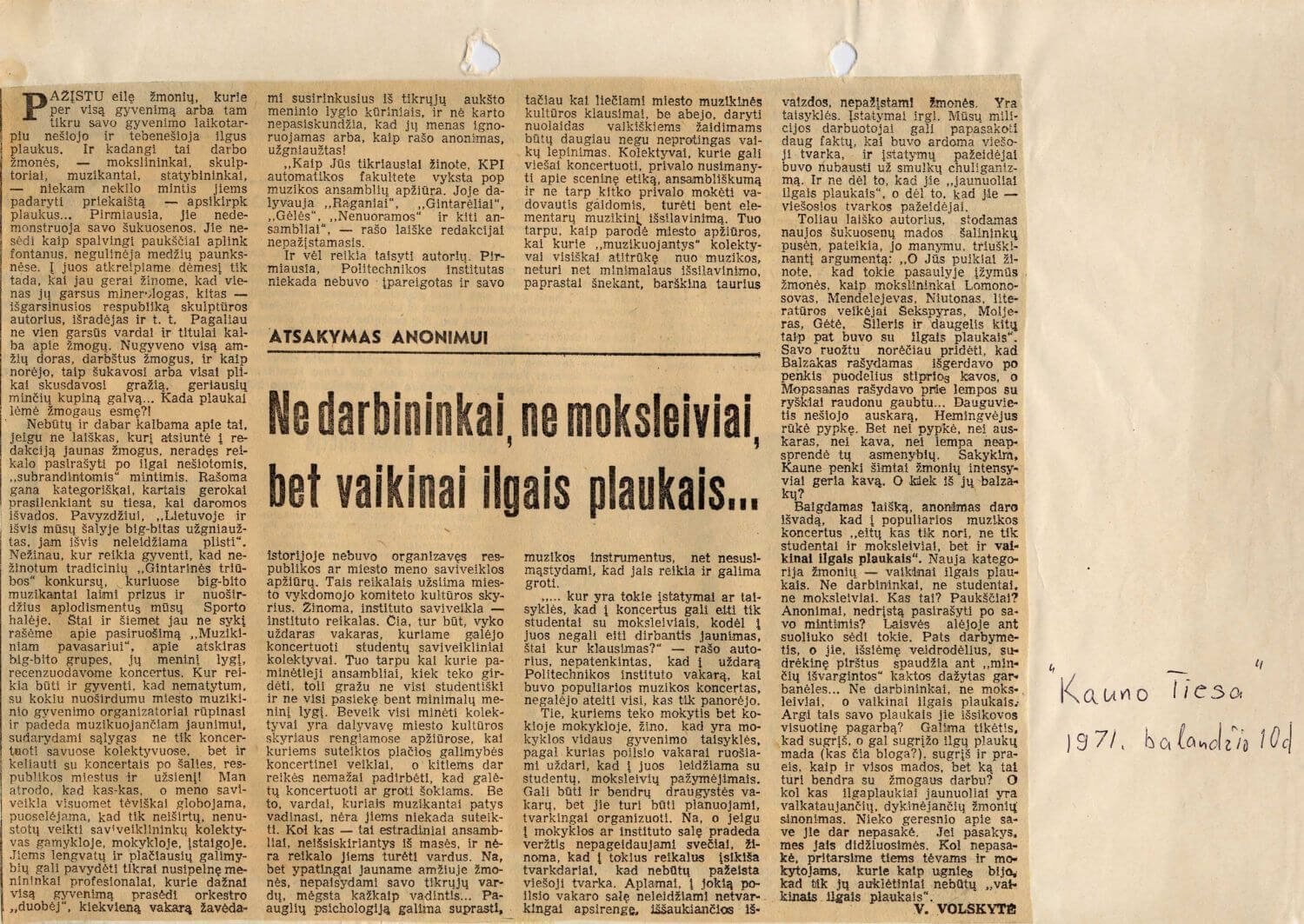 Journalist Vaidilutė Volskytė’s article “Not workers, not students, but boys with long hair…” Volskytė responded to an anonymous letter received by the editorial office of Kauno Tiesa (“Kaunas Truth”). “[…] Moreover, the names that the musicians call themselves were never officially given to them. For now, these are stage ensembles indistinguishable from the masses, and there is no need for them to have names,” wrote V. Volskytė about the rock bands Raganiai (“The Witches”), Gintarėliai (“Little Ambers”), Gėlės (“Flowers”), and others who performed at the “Kaunas Pop Session” festival held on February 20–21, 1971, at the Kaunas Polytechnic Institute’s Faculty of Automation hall and were persecuted by the authorities.