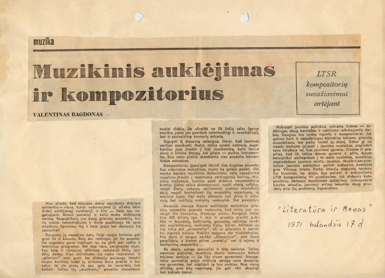 Composer Valentinas Bagdonas, in his article “Musical Education and the Composer” in the weekly Literatūra ir menas (“Literature and Art”), criticizes Lithuanian rock musicians and briefly describes his impressions of the “Kaunas Pop Session” rock festival held on February 20–21, 1971, at the Faculty of Automation hall of the Kaunas Polytechnic Institute.