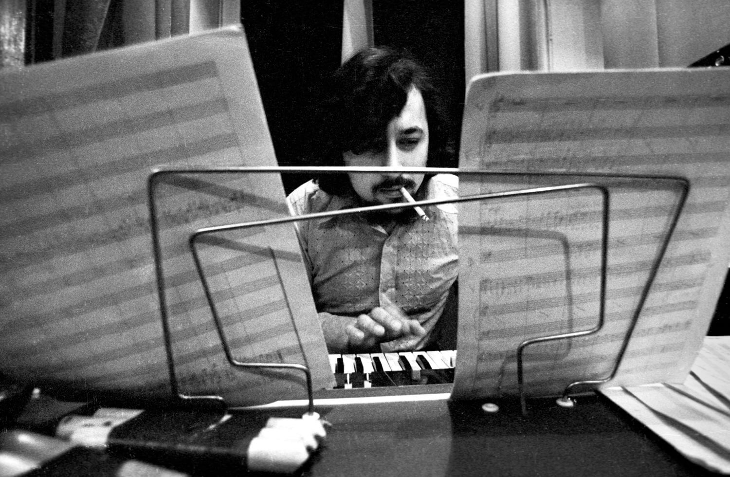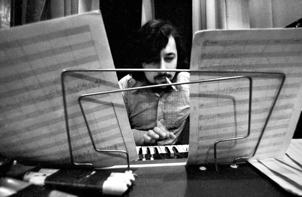 Rehearsal of the first European production of the rock opera Jesus Christ Superstar at the Culture House of Communication Workers (now the Pac Palace). Vidas Petkevičius performs the aria of Jesus Christ. Second from the left is sculptor Mindaugas Nakas (St. Peter), and fourth is Aleksandras Babkovskis, guitarist and keyboardist of the band Antanėliai.