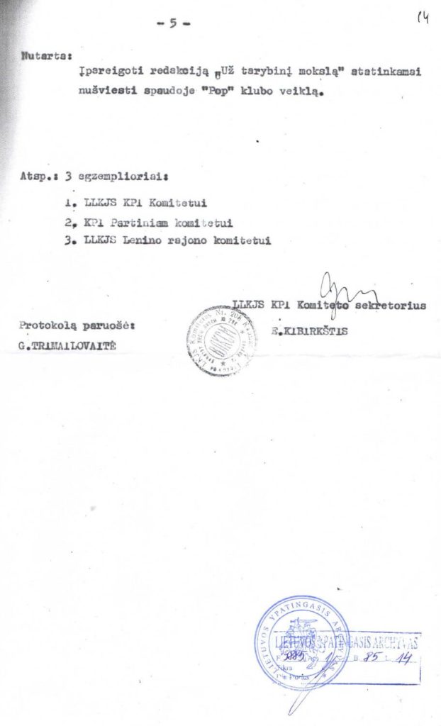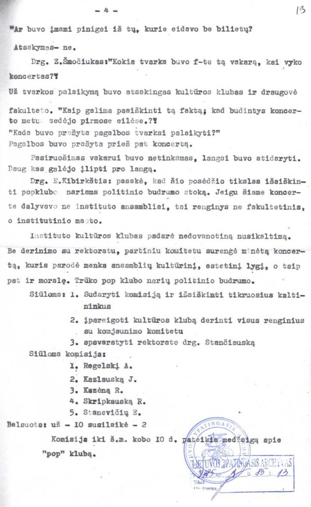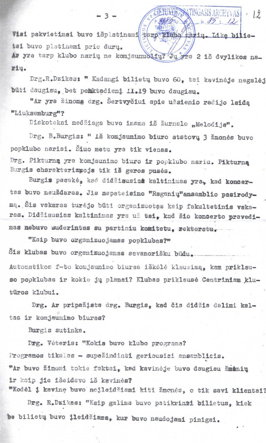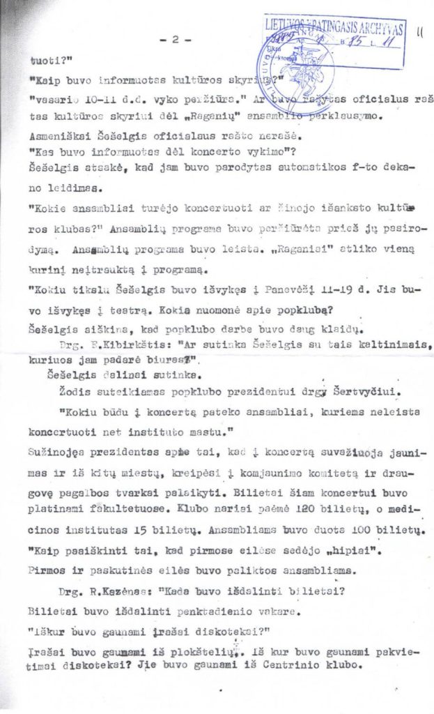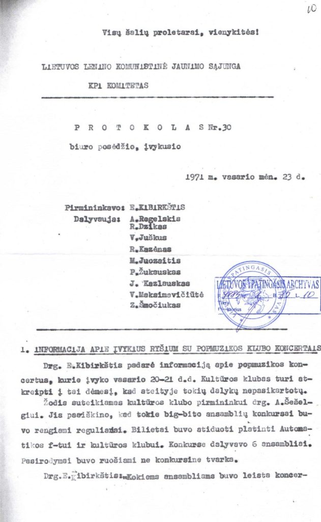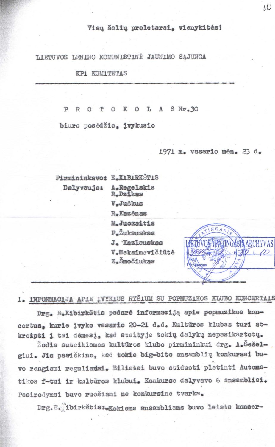 Protocol No. 30 of the meeting of the KPI (Kaunas Polytechnic Institute) Bureau of the Leninist Communist Youth Union of Lithuania, held on February 23, 1971. The meeting addressed the leaders of the pop club “Smūtkeliai”, Algirdas Šešelgis and Robertas Šertvytis, regarding the concert held on February 21–22 in the Faculty of Automation hall. The summoned were reprimanded for the repertoire of the rock band Raganiai, other ensembles who were not allowed “to perform even at the institute level”, the “hippies” sitting in the front rows of the event, and the open windows of the hall. Questions were raised about where the youths obtained music recordings, whether there were any “non–Komsomol members” among the club members, and whether “comrade Šertvytis was aware of the foreign radio program ‘Luxembourg’.” The organizers were accused of holding the concert without coordination with the party committee and rectorate. The activists explained to those summoned that “the main purpose of the meeting was to point out the pop club members’ lack of political vigilance”, which had led to “an unforgivable offense”. A month later, “Smūtkeliai” was shut down, and later the KGB sent Algimantas Šešelgis, one of the event organizers, to “serve” in the occupying army near the dangerous USSR–China border. The regime’s lackeys banned the band Raganiai from rehearsing in the Kaunas Polytechnic Institute hall and from playing at student dance events.
