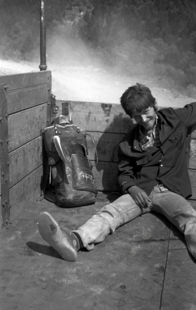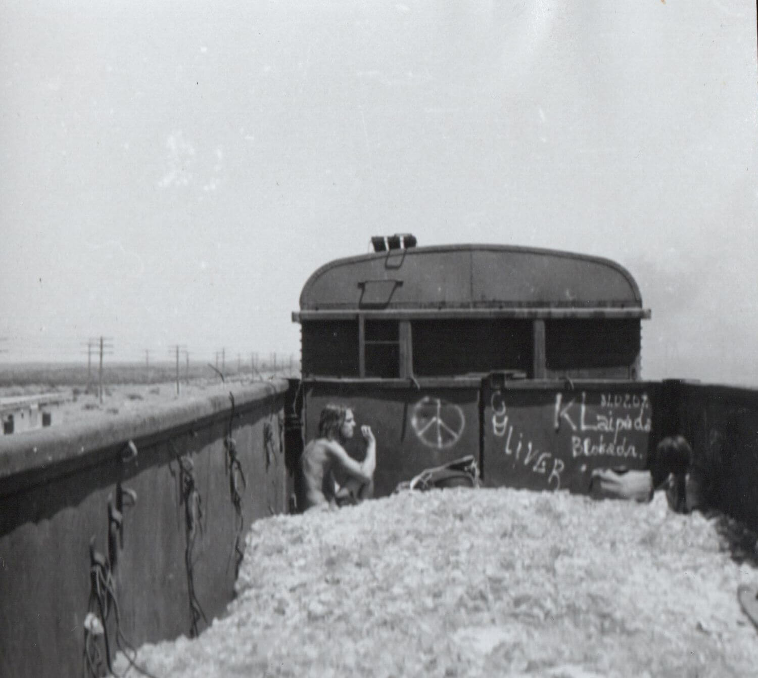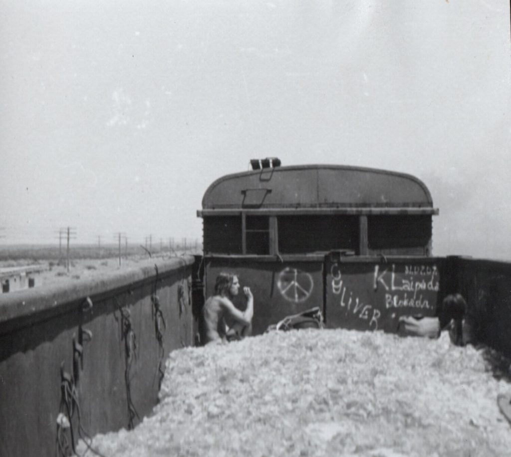 Hippie Jurijus Tolčkovas-Guliveris, a close friend of rebellious artist Gitenis Umbrasas, riding in a freight train car across the vast landscapes of Central Asia. He later died in the mountains of the Mamison Pass in Ossetia (now part of the Republic of North Ossetia–Alania in the Russian Federation and the Russian-occupied territory of South Ossetia).