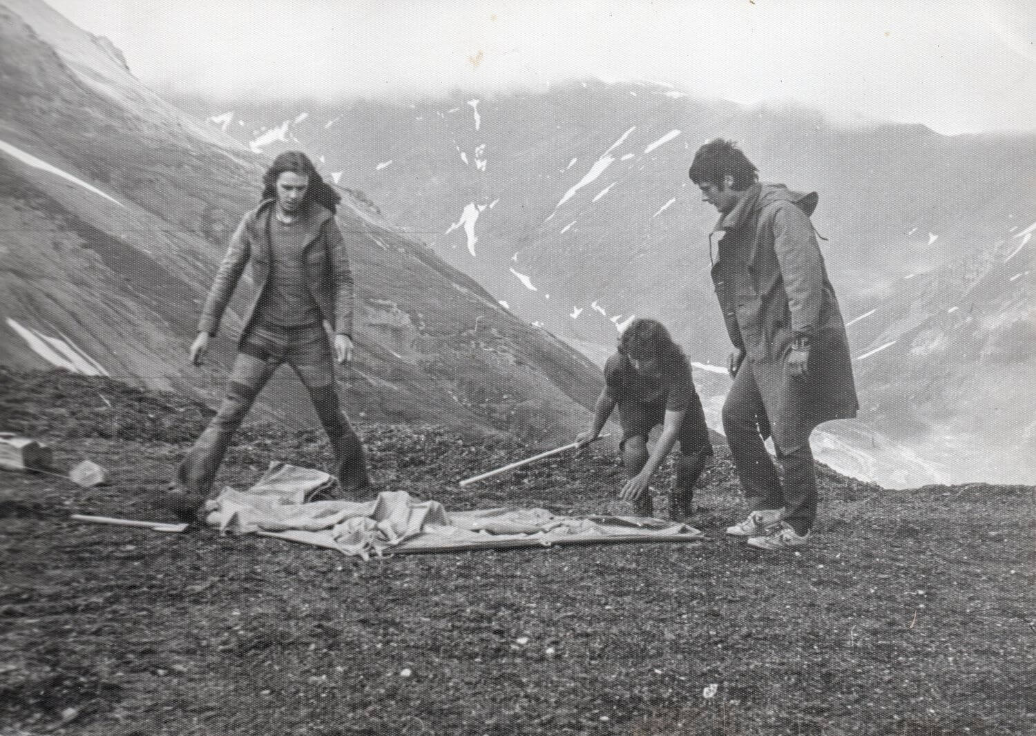 Artist Gitenis Umbrasas (first on the right) and his friends setting up a campsite at the Mamison Pass near the symbolic border between the Russian SFSR and the Georgian SSR (now the Republic of North Ossetia–Alania in the Russian Federation and Russian-occupied South Ossetia).
