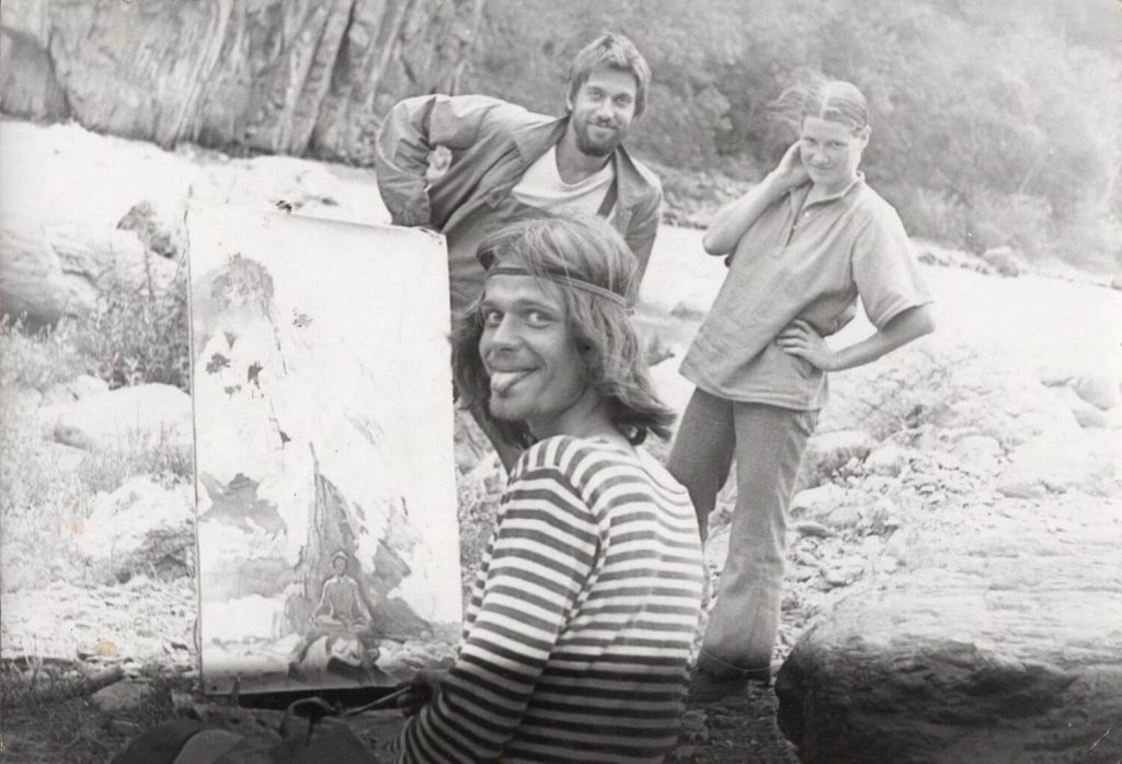Artist Gitenis Umbrasas painting the Caucasus Mountains at the Mamison Pass near the symbolic border between the Russian SFSR and the Georgian SSR (now the Republic of North Ossetia–Alania in the Russian Federation and South Ossetia, occupied by the Russian Federation). Further away – Gitenis’s yoga-practicing friends from Moscow.